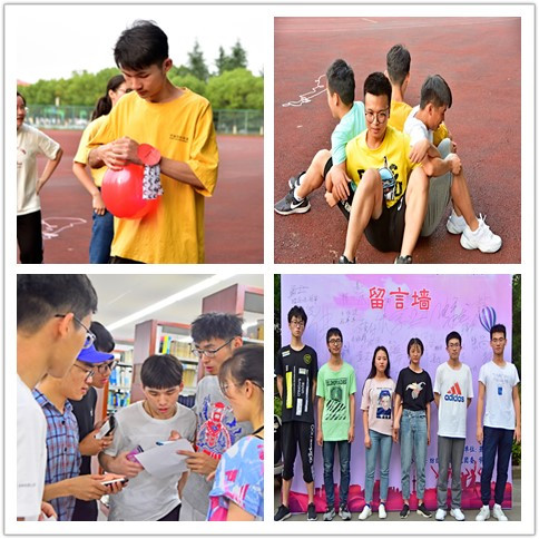 活动开始,参赛队伍奔跑于三个打卡点,在图书馆打卡点,队员们按照要求找出六本指定书籍中的拼图,完成拼图。在这个打卡任务中,各个参赛队员之间分工明确,运用掌握的图书馆知识,寻找指定的图书,于书海中进行时间的争夺。操场打卡点,由盲人方阵、坐地而起和运送气球三个项目组成,在这个打卡点,队员之间配合默契,争取用最快的速度完成任务,体现了高度的团队意识。情人桥打卡点,队伍需在此完成你来表演我来猜的游戏,队员们凭借良好的默契和身体表达能力,完成打卡任务。