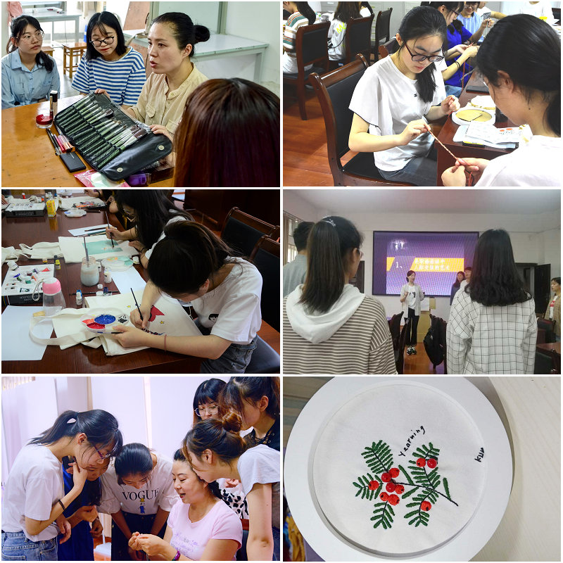 此次锦绣纺服公益计划,同学们对传统刺绣艺术的热情最为热烈,学院增设了两个刺绣班,还为刺绣班的每位同学都配备绣棚、绣线等基本工具。61日开始,每到周六,在D214,都会看到党员教师邬红芳教授带领同学们沉浸在刺绣美学中的身影。邬红芳老师亲切优雅的给同学们讲诉了刺绣的起源、刺绣所包涵的意义、刺绣在历史上的发展以及国内外刺绣的不同之处。随后邬老师又为同学们亲身示范了刺绣的十余种基础针法,并针对每个学员的情况,进行手把手教学。最终,同学们在自己的努力和老师的耐心帮助下完成了人生中的第一件绣品,也度过了充实有意义的周末时光。