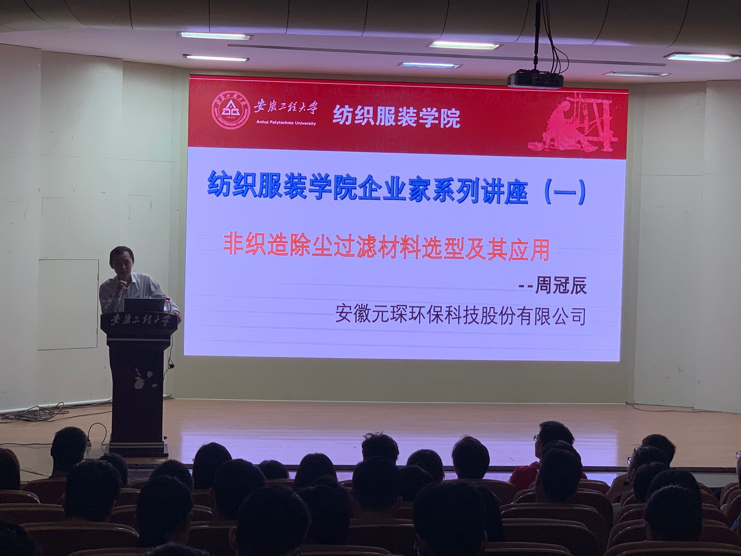周冠辰为纺织工程专业2011届毕业生,自工作以来主要从事非织造过滤材料性能研究和工业除尘滤料产品的开发,在电厂、水泥厂、垃圾焚烧厂、钢铁厂等行业烟气除尘滤料选型上有着丰富的经验。周冠辰以丰富的市场经验,专业的知识功底为师生们阐述了工业过滤的重要性,非织造过滤材料的种类、选配和应用。工业排放废气是造成大气污染的主要来源之一,随着社会对环保的要求日益提高,对工业废气的排放要求越来越严格,非织造滤料在废气处理领域大有作为。同时,周冠辰介绍了高温过滤材料的核心技术,包括负载催化剂、多种污染物协同控制,功能性后处理,针孔热熔覆膜等,分析了废旧滤料带的回收利用的研究现状,他呼吁从事纺织工程专业的学生能投身到产业用纺织品行业,为中国工业发展添砖加瓦。报告中,他还与专业老师对高性能纤维非织造布的高温抗氧改性等专业问题进行了交流探讨。整个报告内容丰富,讲解结合企业发展,深入浅出。通过报告,纺织专业的师生对非织造材料的发展和应用有了进一步的认识。
