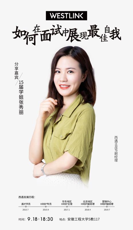 张秀丽为外国语学院外语专业2015届毕业生,毕业后求职深圳西遇时尚服饰有限公司,从短短的四年中从公司专员到华东地区主管再到公司北京地区HRBP副经理,现担任公司营销中心HRBP经理。一步一个脚印,从一个职场新人到今天的公司精英,积累了丰富的职场经验,通过自己的现身说法与即将求职的应届毕业生分进行了分享,通过交流让应届生们在求职心态、应聘技巧、面试技巧等方面有了更深入的了解,为即将到来的毕业季多了一份针对性的准备。