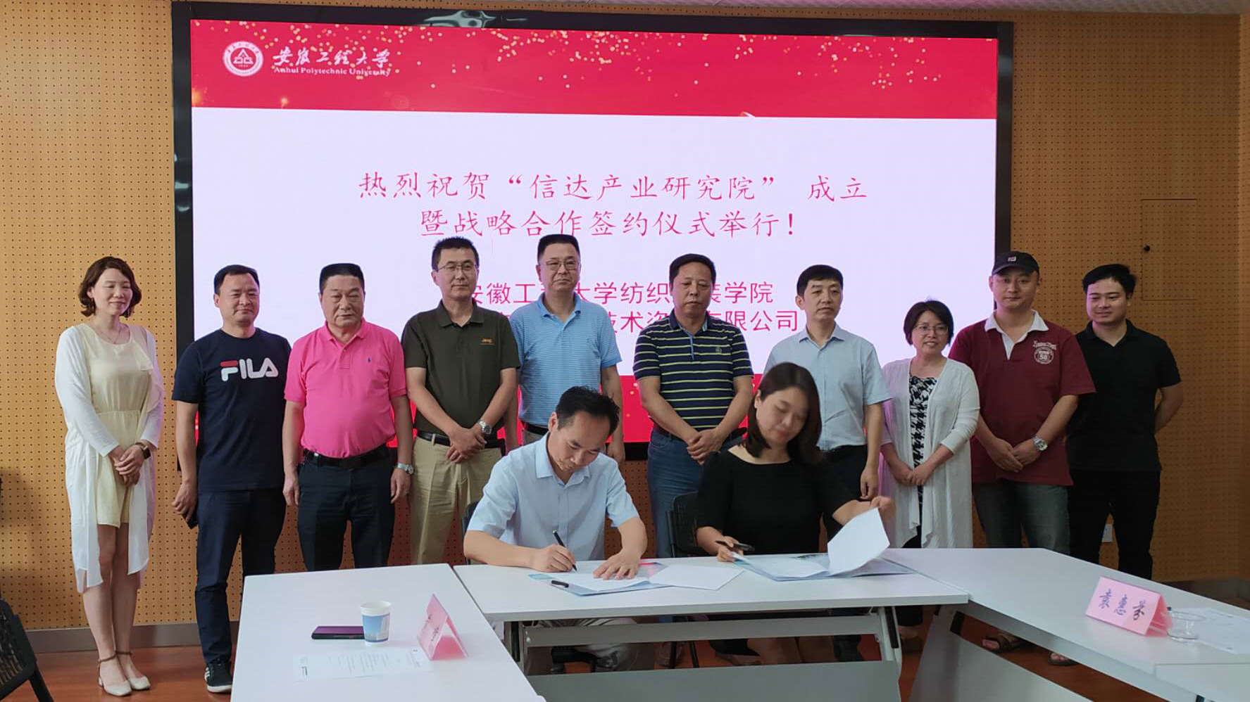 近日,纺织服装学院和安徽信达工程技术咨询有限公司战略合作暨信达产业研究院成立签约仪式在我校隆重举行。安徽信达工程技术咨询有限公司法人代表程益先、芜湖企业联合会高新区工作站站长李成培、学院党委书记冉昆玉、院长李长龙、副院长徐珍珍、袁惠芬及部分专业教师和企业家代表共同参加了签约仪式。
