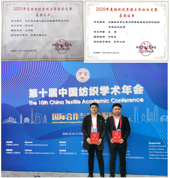 近日,由中国纺织工程学会主办、江南大学承办的第十届中国纺织学术年会在无锡举行。来自全国的纺织院校师生和相关企业代表共650余人参加了此次年会。会上评选出2020年度纺织优秀博士学位论文奖获奖论文6篇,优秀硕士学位论文奖获奖论文10篇。其中纺织服装学院王宗乾教授指导研究生杨海伟获优秀硕士学位论文奖,纺织服装学院新入职教师、东华大学王勇博士获优秀博士学位论文奖。
