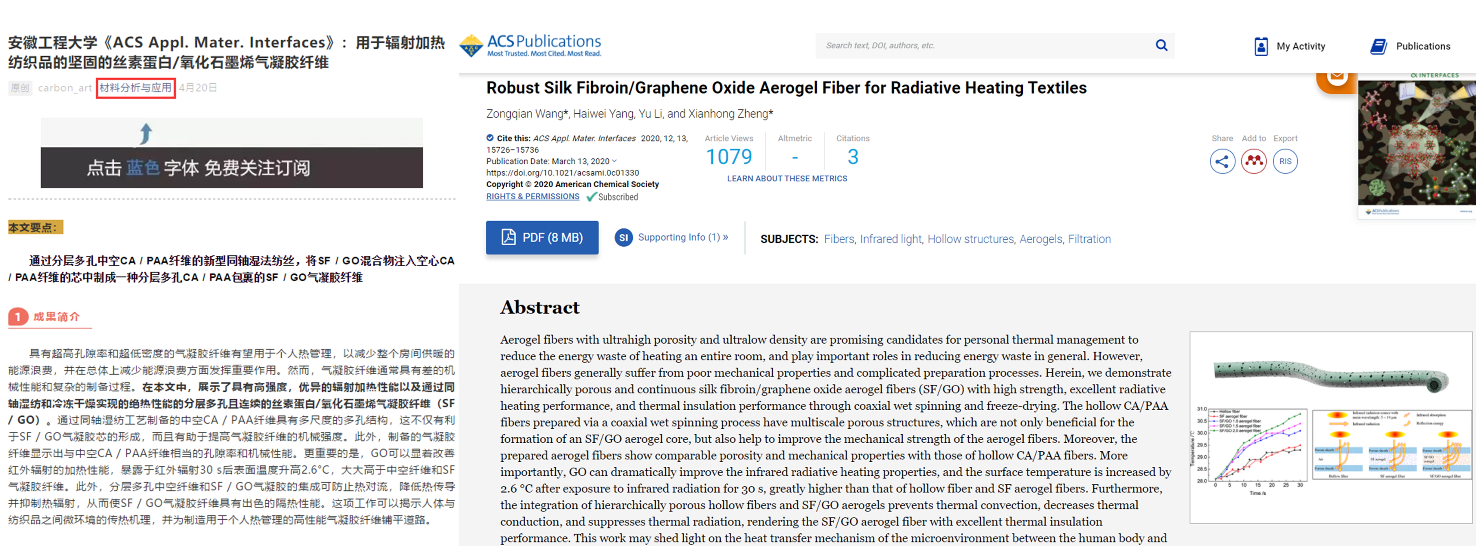 相关成果以“Robust Silk Fibroin/Graphene Oxide Aerogel Fiber for Radiative Heating Textiles”为题在ACS Applied Materials & InterfacesIF8.758,中科院一区TOP期刊)上发表后,材料领域微信公众号—“材料分析与应用”也以“日韩欧美福利视频_黑人巨大人精品欧美三区_欧美成人另类人妖_欧美在线精品一区二区三区_欧美一区二区三区性视频_日韩精品欧美视频_性欧美极品xxxx欧美一区二区《ACS Appl. Mater. Interfaces》:用于辐射加热纺织品的坚固的丝素蛋白/氧化石墨烯气凝胶纤维”为题进行了重点报道,并在智能可穿戴领域引起广泛关注,目前该论文浏览量已经超过1000余次。该论文第一、二作者分别为王宗乾和2017级研究生杨海伟,通讯作者为郑贤宏博士。此外,该研究成果也得到了安徽省重点研究和发展计划项目(1804a09020077)、芜湖市科技计划项目(2018pt04)、安徽省重大科技专项(201903a05020028)和日韩欧美福利视频_黑人巨大人精品欧美三区_欧美成人另类人妖_欧美在线精品一区二区三区_欧美一区二区三区性视频_日韩精品欧美视频_性欧美极品xxxx欧美一区二区引进人才科研启动基金(2020YQQ002)等项目的支持。
