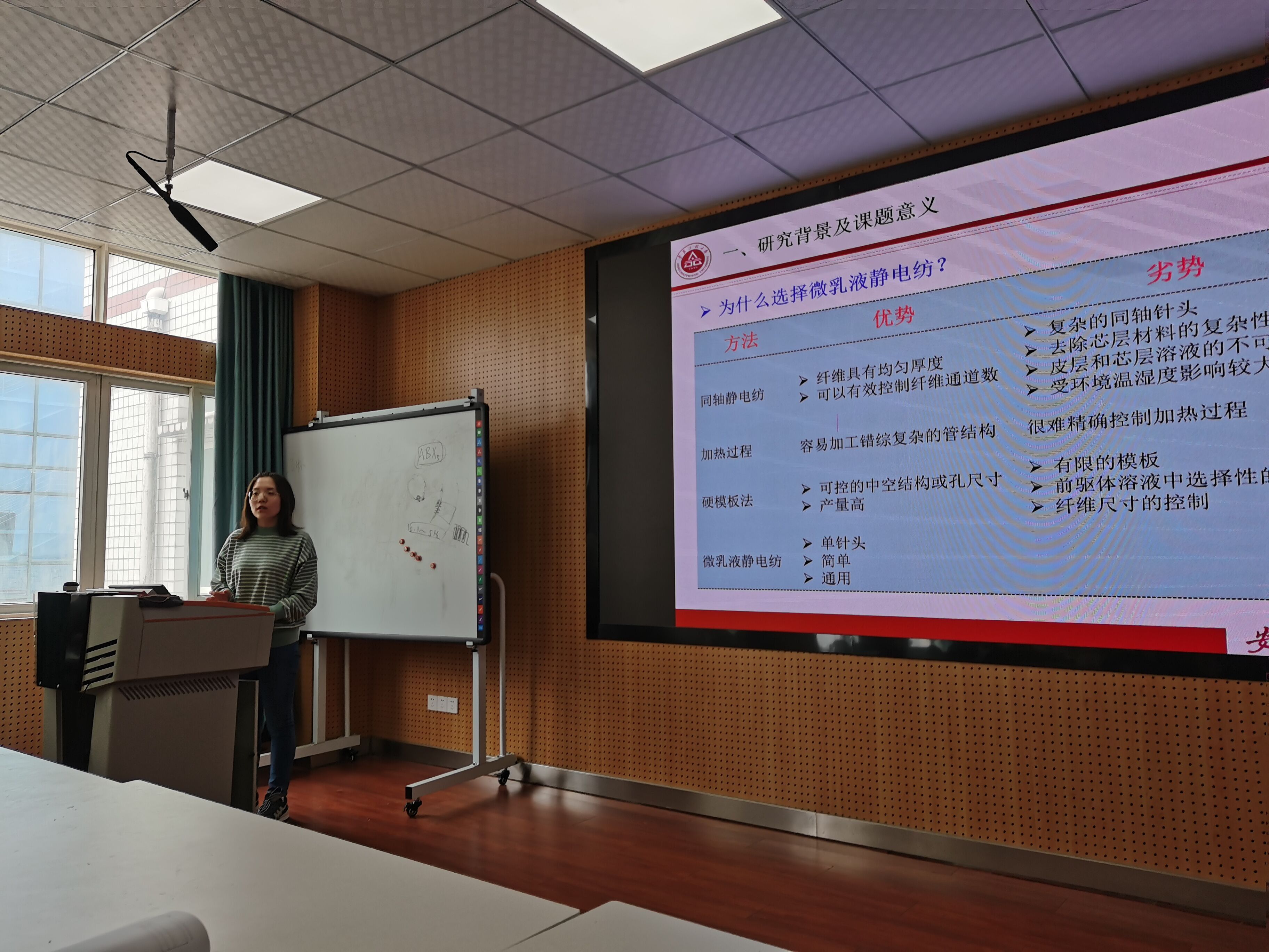 张瑾博士汇报了“微乳液静电纺丝法多尺度纳米纤维制备及应用研究”的课题,介绍了同轴及多流体静电纺丝技术制备中空及多通道纳米纤维的缺点,引出了微乳液静电纺丝方法的优点和最近的研究进展,指出了提高纳米纤维结构的确定性和可控性的必要性。许青波博士汇报了“‘雾聚合’接枝修饰纤维素材料表面的反应机制及性能研究”的课题,介绍了“雾聚合”技术在纺织面料棉织物的表面纤维上构建功能层的由来和特点,讲解了采用雾接枝聚合法在疏水、抗菌层制备的研究成果,提出了采用“通过法”的优点,对于开发耐久性强、穿着舒适的智能纺织面料具有重要意义。