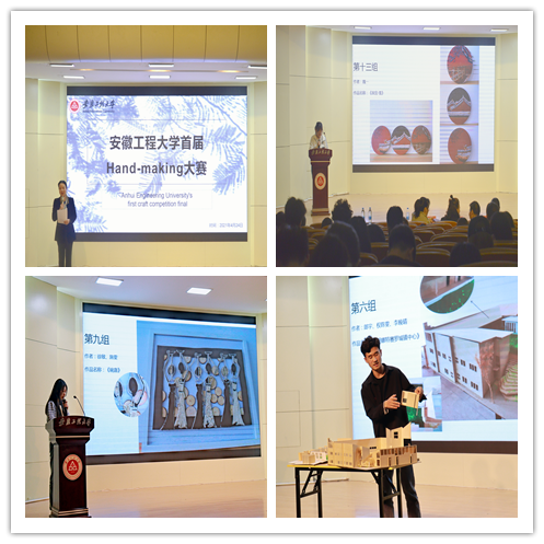 Hand-making大赛经过前期的初赛、复赛,最终有来自六个学院的十七组作品进入决赛。在决赛现场,伴随着作品的展示,选手们对创作动机、创作过程以及作品表达的含义进行了讲解。一个个作品外观精美,做工细腻,创意独到,选手们的细致生动的展示,让在场的观众不禁拍手称赞。漆画《故宫•雪》,以独具中国特色的故宫为素材,使用红色作为主色调,黄白的点缀使其锦上添花,朱墙黄瓦,光辉夺目,雕梁画栋,美轮美奂,完美地突出了故宫的气派,让人不禁叹为观止;《珊娜特赛罗城镇中心》,则突破了传统二维表现,采用了立体模型形式,用纸板等作为材料,按照1:50的比例构建出珊娜特赛罗城镇中心的模样,并且现场拆卸组装,可见其细节之精细,手法之巧妙。邬红芳老师对本次比赛进行了点评,她充分肯定了参赛的所有作品,作品形式丰富,包括漆画、金丝线画、刺绣、雕塑等,有现代艺术的创新创造,也有中国传统工艺的弘扬;作品内涵有深度,有的作品传达了环保理念,有的作品传承了红色文化,体现了青年学生良好的审美观念和实践能力。