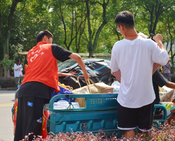 根据学校疫情防控要求,新生家长不能进校园,这就大大增加了新生搬运行李的负担,为扎实落实我为新生办实事工作,学院贴心选择在图书馆广场设置迎新点,方便新生办理报道手续后直接前往宿舍。同时提前租借三轮车为新生行李搬运,为新生提供暖心服务。