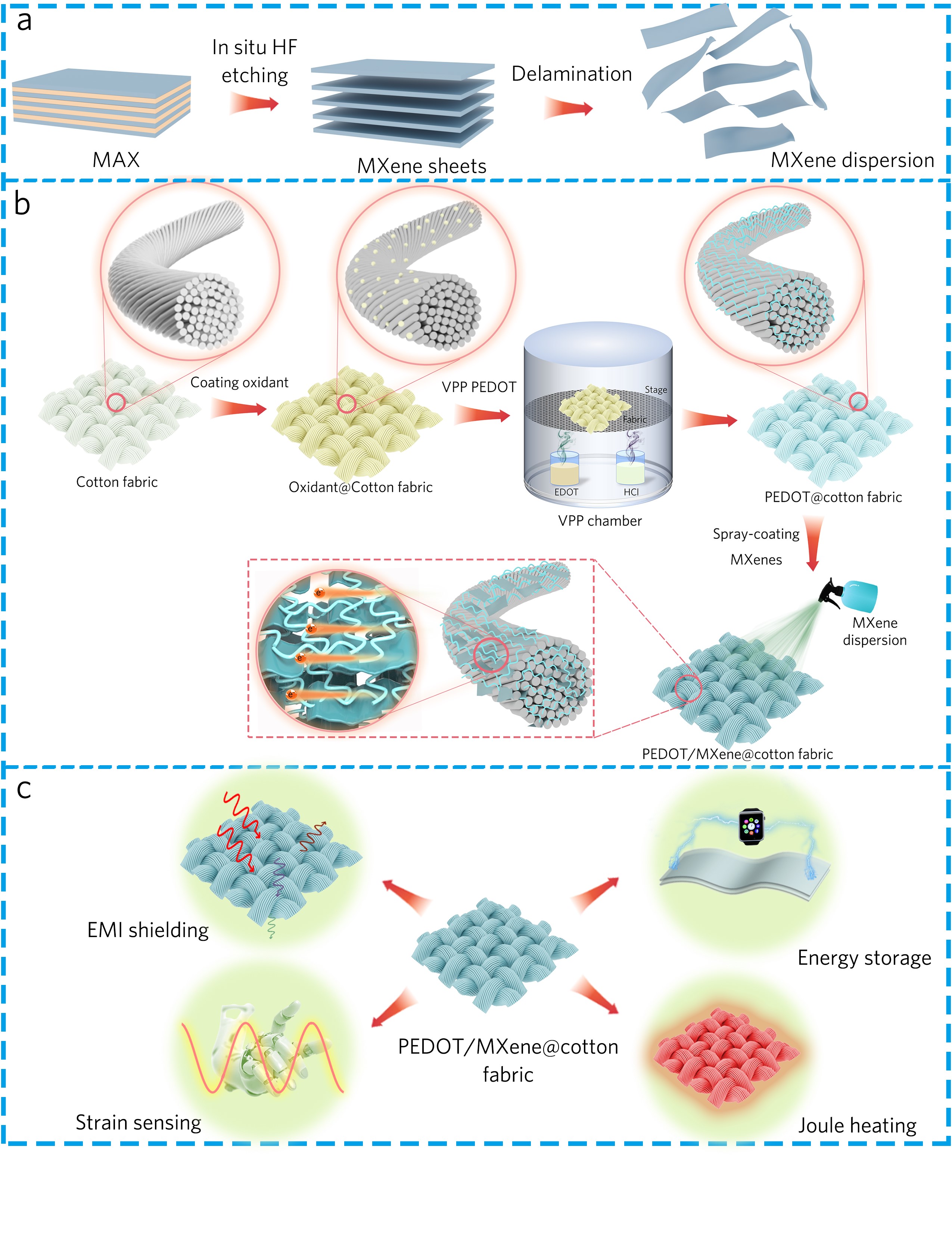 多功能集成纺织品一直被认为是一种理想的可穿戴电子器件的制备方法。然而,织物在功能集成的过程中如何不牺牲织物固有性能始终是一项重要挑战。针对上述问题,我校纺织服装学院智能可穿戴研究团队经过长期研究攻关,取得系列重要进展,相关成果分别以“Vapor phase polymerized conducting polymer/MXene textiles for wearable electronics”和“Multifunctional RGO/Ti3C2Tx MXene fabrics for electrochemical energy storage, electromagnetic interference shielding, electrothermal and human motion detection”为题发表于Nanoscale(中科院1区TOP,IF=6.895)和Materials & Design(中科院1区TOP,IF=6.289),论文均以日韩欧美福利视频_黑人巨大人精品欧美三区_欧美成人另类人妖_欧美在线精品一区二区三区_欧美一区二区三区性视频_日韩精品欧美视频_性欧美极品xxxx欧美一区二区为第一单位,第一作者为郑贤宏博士,通讯作者为王宗乾教授。该研究分别开发了一种基于石墨烯/过渡金属碳化物/氮化物(MXene)改性纺织品和气相聚合PEDOT/MXene改性纺织品,制备的纺织品具有优异的导电性、透气性和柔韧性,展现出优异的电化学性能(比电容:1000 mF/cm2),电热性能(表面温度:193.1°C)和电磁屏蔽性能(屏蔽效能,36.62 dB),并具有优异的低应变传感性能,可用于检测人体多种运动状态。该研究成果在智能纺织品领域具有广泛的应用前景,为功能性纺织品的结构设计提供了新方法和新思路,为智能可穿戴器件的发展奠定了基础。