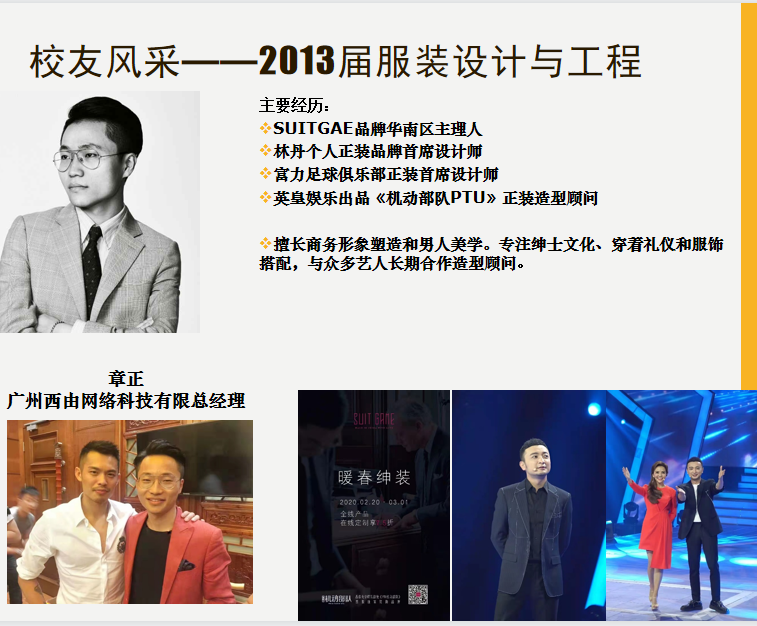 章正,广州西由网络科技有限总经理,服装设计与工程2013届毕业生。UITGAE品牌华南区主理人,林丹个人正装品牌首席设计师,富力足球俱乐部正装首席设计师,英皇娱乐出品《机动部队PTU》正装造型顾问。