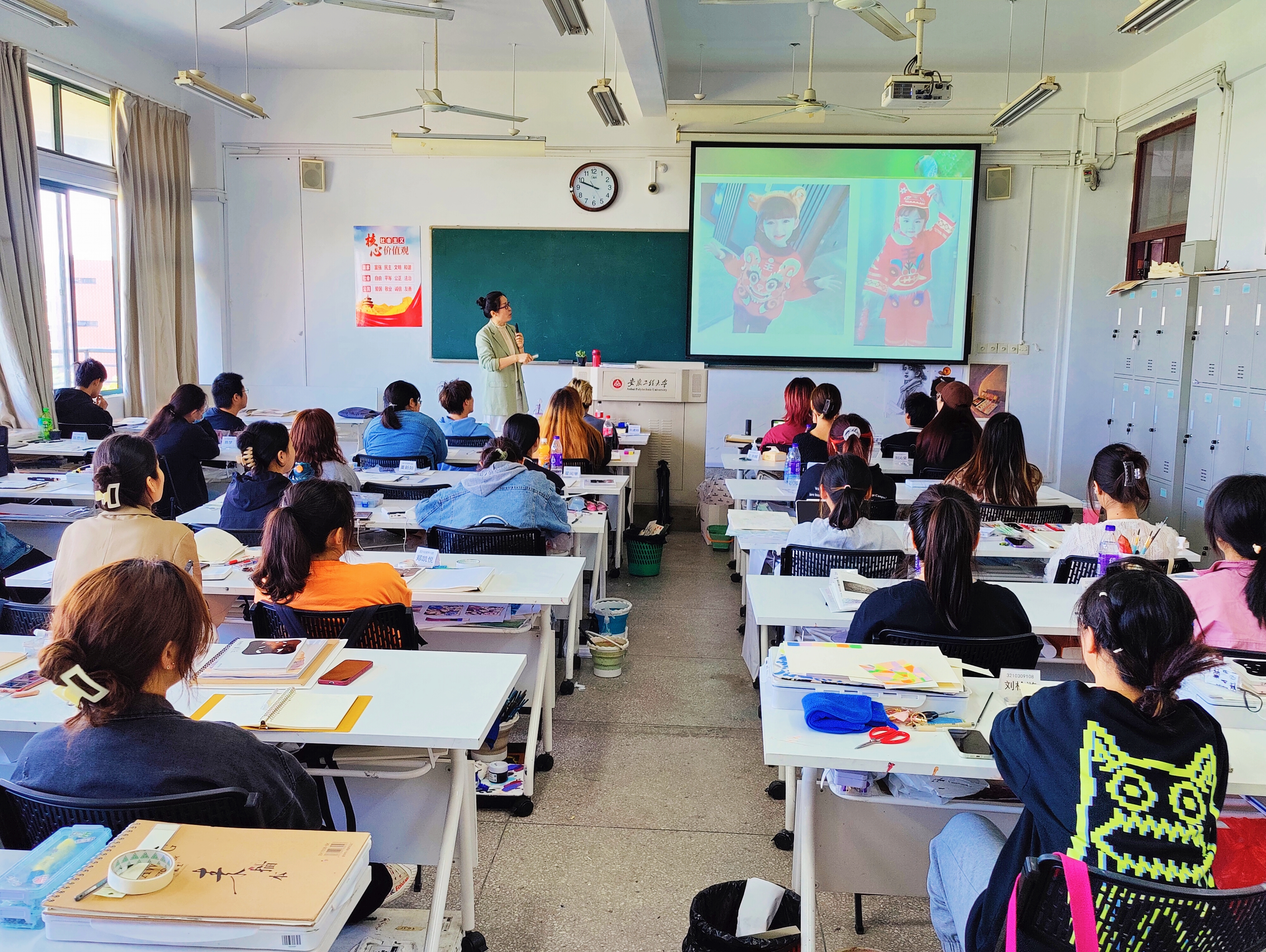 48日上午,纺织服装学院在6J503组织开展了“金”彩一课示范教学观摩活动。本次观摩课由邢英梅老师主讲,课程为《图案设计》。学院教学副院长、服装系正副主任及青年教师进行了现场听课观摩。