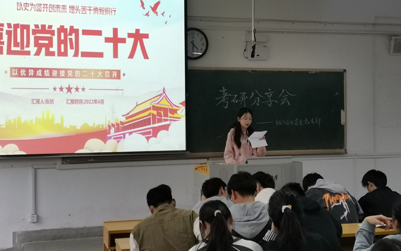 会议伊始,张旭就“喜迎党的二十大”为主题,强调当代大学生使命责任担当,应以优良的学风、优异的成绩迎接党的二十大召开,并先后介绍了考研成功上岸的学子。