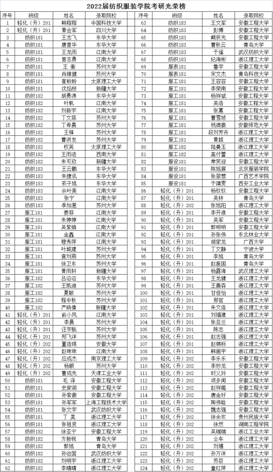 随着各高校2022年考研录取陆续结束,纺织服装学院捷报频传,目前已有124名学生考取研究生,平均考研录取率高达38.75%,其中轻化工程专业考研录取率达到55.56%,较去年同期提高10.28个百分点,再创新高。录取院校不断向高水平院校聚集,其中不乏中国科学技术大学、四川大学等国内知名高校。