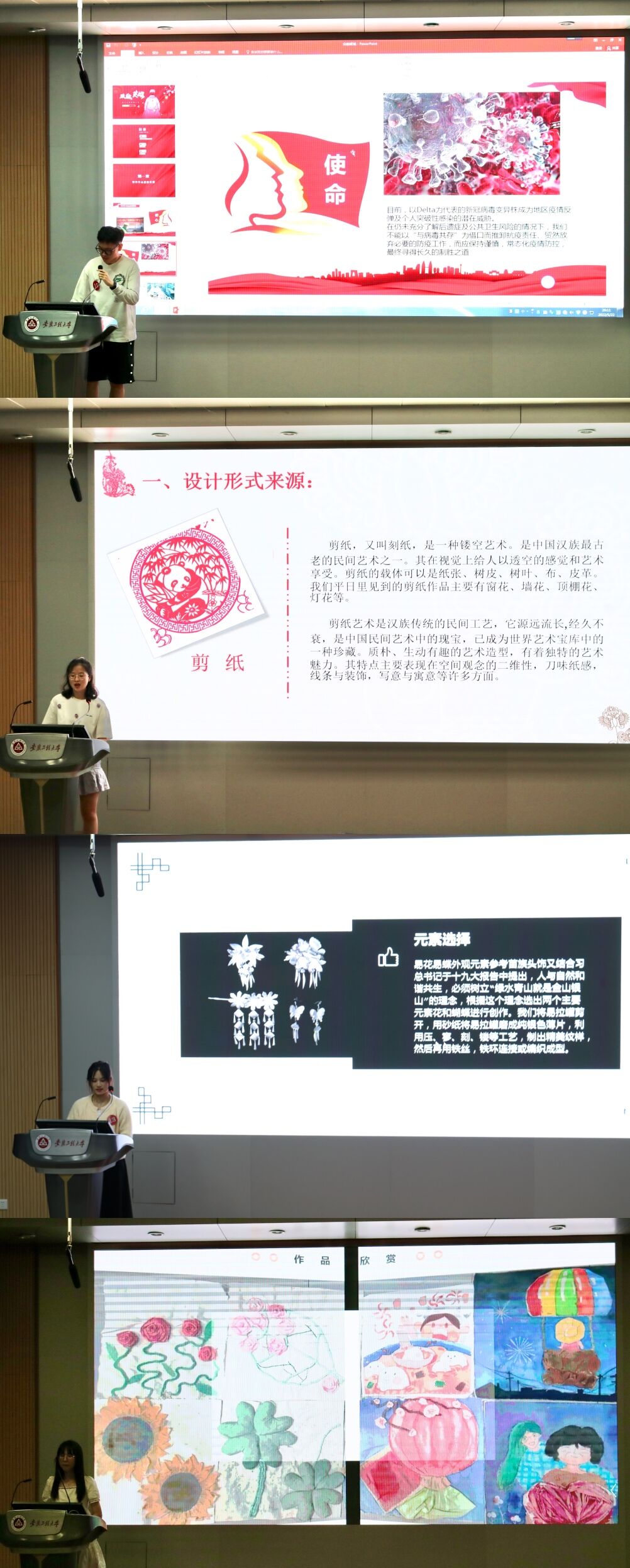 本次大赛分为初赛和决赛两个阶段,最终有来自五个学院的十五组作品进入决赛进入决赛。决赛现场,选手们从设计灵感、作品构成、创作过程和作品寓意四个方面对作品进行讲解,并现场展示设计成果。一个个作品细节精美、构思巧妙,做工细腻,让在场的观众不禁拍手称赞。拼布作品《花花世界,静守己心》以环环相扣的花朵为图样,对面料进行裁剪粘贴,再用手缝针补充细节。突显出“世间万物绚烂夺目,亦错综复杂;美好恬静,亦喧嚣浮躁。”的主题,让人眼前一亮。剪纸作品《珍爱》, 围绕保护环境的主题,将动物与花相结合代表着团团圆圆,表达出对自然环境越来越好的期盼。作品《众志成城》展示了疫情中艰苦奋斗、默默奉献的普通人的群像,经过艺术加工,最终将其整合到一起,构成了一幅完整的画面。S型的构图好似曲折蜿蜒的长城,对应人民组成的护国长城,呼应了标题“众志成城”。纺织服装学院教授邬红芳老师对本次比赛进行了点评,她充分肯定了参赛的所有作品,作品形式丰富,包括剪纸、拼布、毛毡、雕刻等,有现代艺术的创新创造,也有中国传统工艺的弘扬;有结合自然与环保,也有红色精神的传承发扬,充分展现出同学们敢于尝试,不断创新的热情。