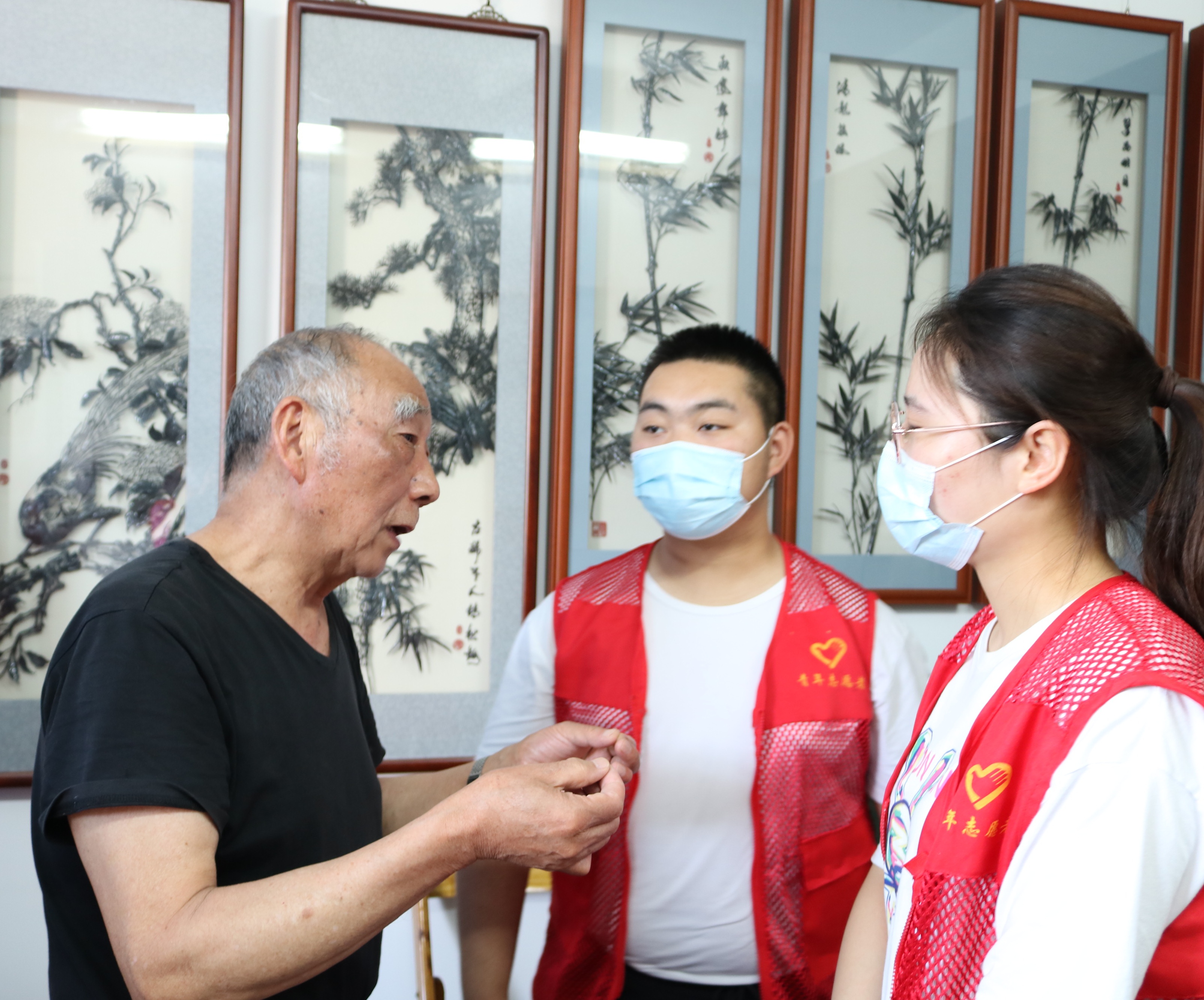 步入博物馆,映入眼帘的是一幅幅芜湖铁画著作,墙壁上的铁画著作栩栩如生,以锤代笔,以铁作墨,以砧为案,经剪、叠、铆、錾、锻、焊、锉等多道独特的手工技艺,才得以成画。画面黑白分明,虚实相生,同学们被其深深吸引,感叹铁画恢弘壮丽的同时,更钦佩工匠们的精湛技艺。志愿者们拜访了当代铁画大师汤传松老师,并在老师的带领下了解了芜湖铁画的制作过程和发展现状,并谋划了下一步暑期社会实践活动方案。