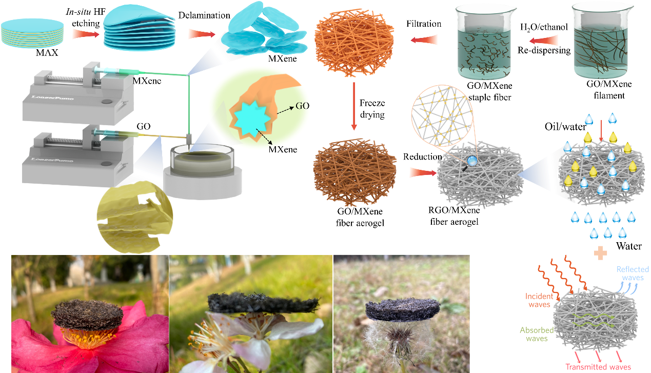 本研究通过原位氢氟酸刻蚀法制备单分散MXene分散液,并将其作为芯层纺丝液,以氧化石墨烯分散液为皮层纺丝液,采用同轴纺丝法首先制备皮芯型氧化石墨烯/MXene胶体纤维,随后通过湿法熔融组装技术和冷冻干燥技术制备氧化石墨烯/MXene纤维气凝胶,最后通过化学还原制备具有融合结构的皮芯型石墨烯/MXene纤维气凝胶。制备的皮芯型石墨烯/MXene纤维气凝胶由于具有高疏水、高导电、质地轻、孔隙率高、隔热保温等特点,有望在电磁屏蔽、油水分离以及高温隔热和人体热量管理等领域具有良好的应用前景。该项工作有助于进一步理解异质结构与MXene环境稳定性的构效关系,也为构筑高耐久性MXene基功能材料提供了新思路和新方法。