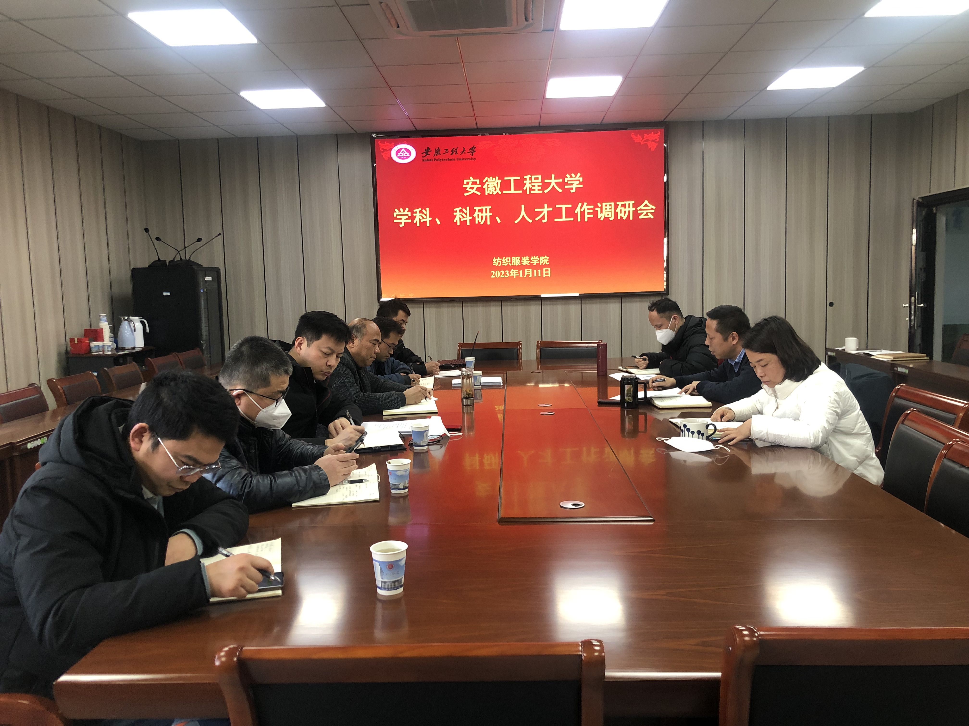 111日下午,校党委常委、副校长费为银带领研究生部主任(科技处处长)凤权、科技处副处长王宗乾、研究生部副主任刘宏建、人事处副处长徐晓平、科技处副处长王刚等同志赴纺织服装学院调研指导学科、科研、人才工作。纺织服装学院院长李长龙、党委副书记徐珍珍、副院长陶旭晨参加调研会,会议由凤权主持。