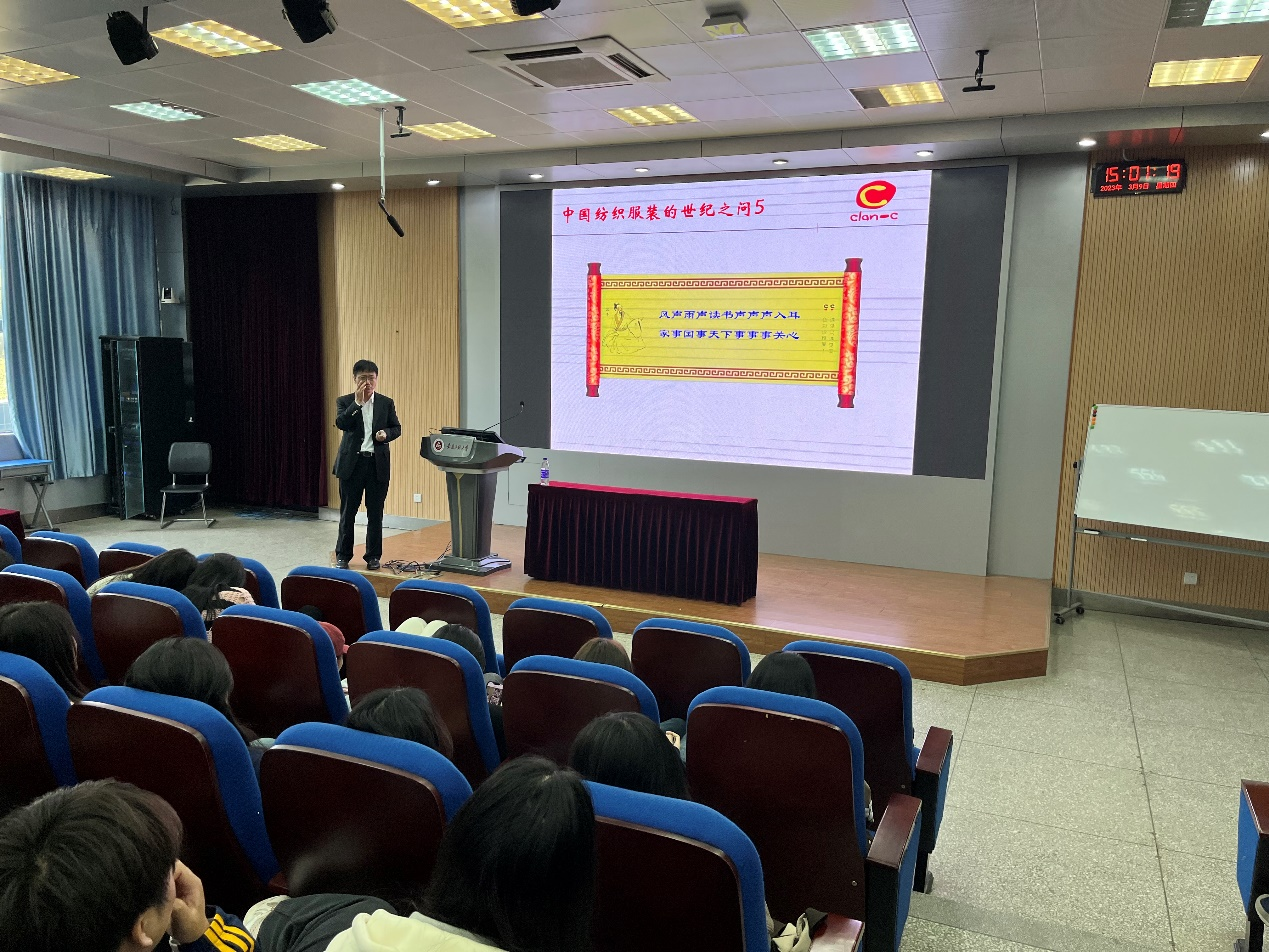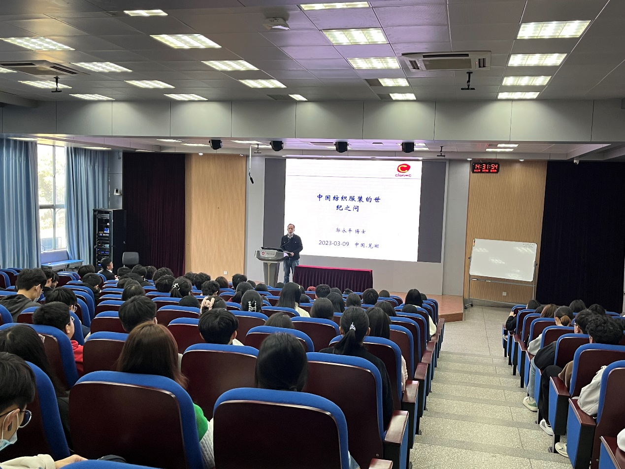 郭永平博士围绕“什么行业好?中国纺织服装面临东南亚国家的挑战还行么?同学们是否参观过纺织机械展?中国纺织服装就业是否可以养家糊口?新时期的大学生在校应该做什么?”等5个问题进行了深入浅出的分析和讲解。他用生动形象的话语讲述了纺织服装学科的生命力。他指出,与房地产、金融、芯片、钢铁、水泥、航空等多个行业相比,纺织服装行业是中国的领先行业,是全球最具有竞争力的一个行业。