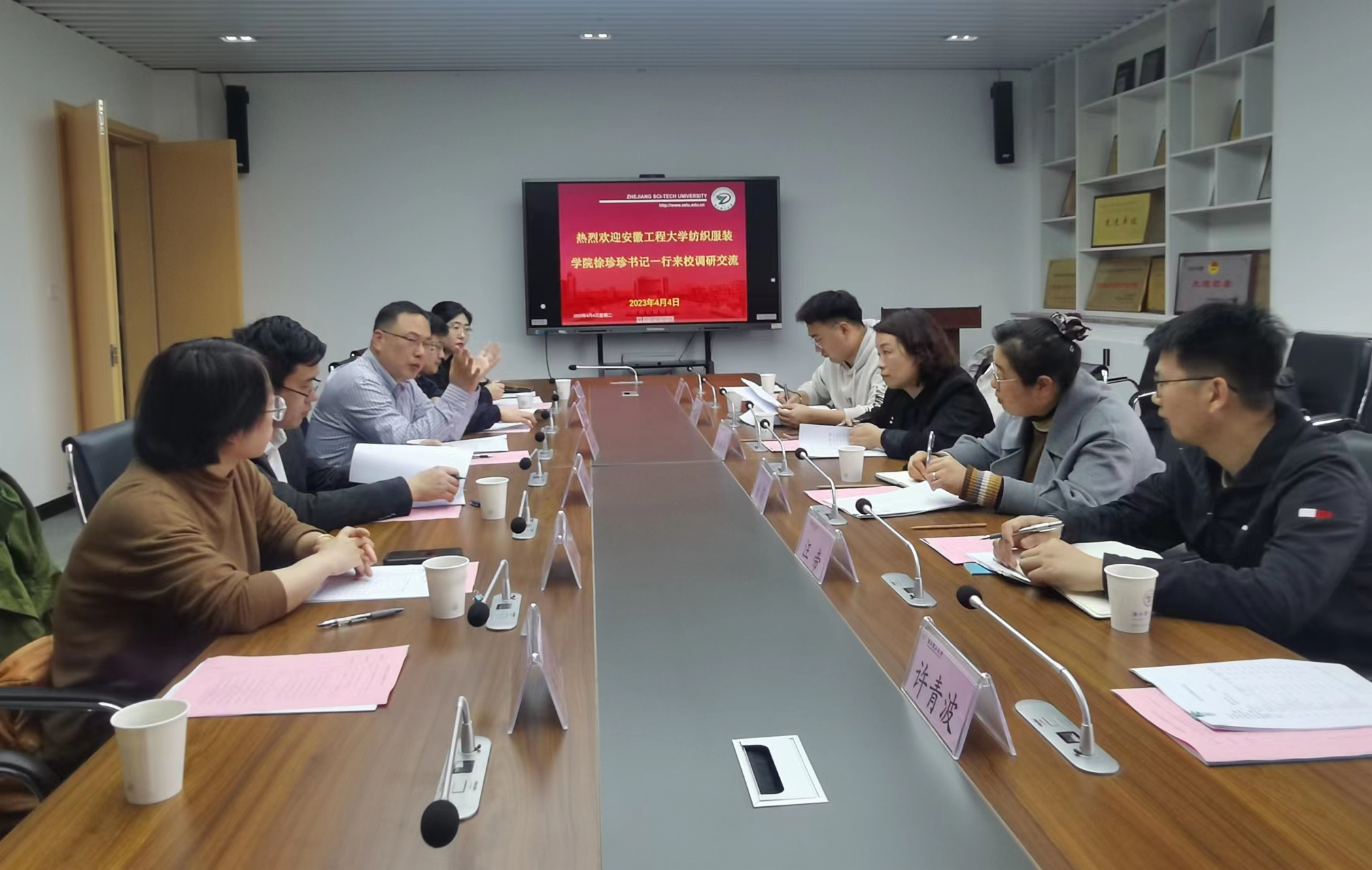 于斌代表浙理工纺织学院对徐珍珍一行来院调研交流表示欢迎,从历史沿革、组织机构、师资队伍建设等方面简要介绍了学院的情况,重点就学科建设、专业发展、人才培养研究院建立和科研成果转化等先进做法进行了分享交流表示兄弟院校间要加强互动交流,相互支持共同发展。徐珍珍对学院的热情接待表示感谢,介绍我校纺织服装学院近几年的建设情况和短板不足分析了安徽纺织产业融入长三角的发展趋势,指出需积极借鉴兄弟高校的发展经验,特别在长三角纺织服装一体化人才培养、面向产业的社会合作和科技成果转化等方面学习先进,迎头赶上。
