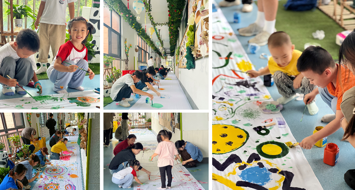 经过一周的协作,志愿者团队同孩子们一起完成了全部创作。作品被悬挂在幼儿园走廊天花板上,富有童真童趣的绘画,装点着校园,传递着美好,温润着心灵。