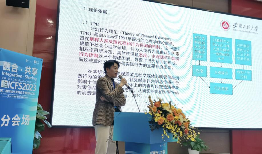 袁惠芬受邀主持了分会场会议,与来自各国的学者深入交流了时尚与可持续发展的相关议题,孙旭之老师做了社交媒体对时尚奢侈品消费及品牌可持续发展的影响报告,研究生代表薄泽明汇报了基于三维虚拟试衣技术的可持续性服装设计的相关研究。