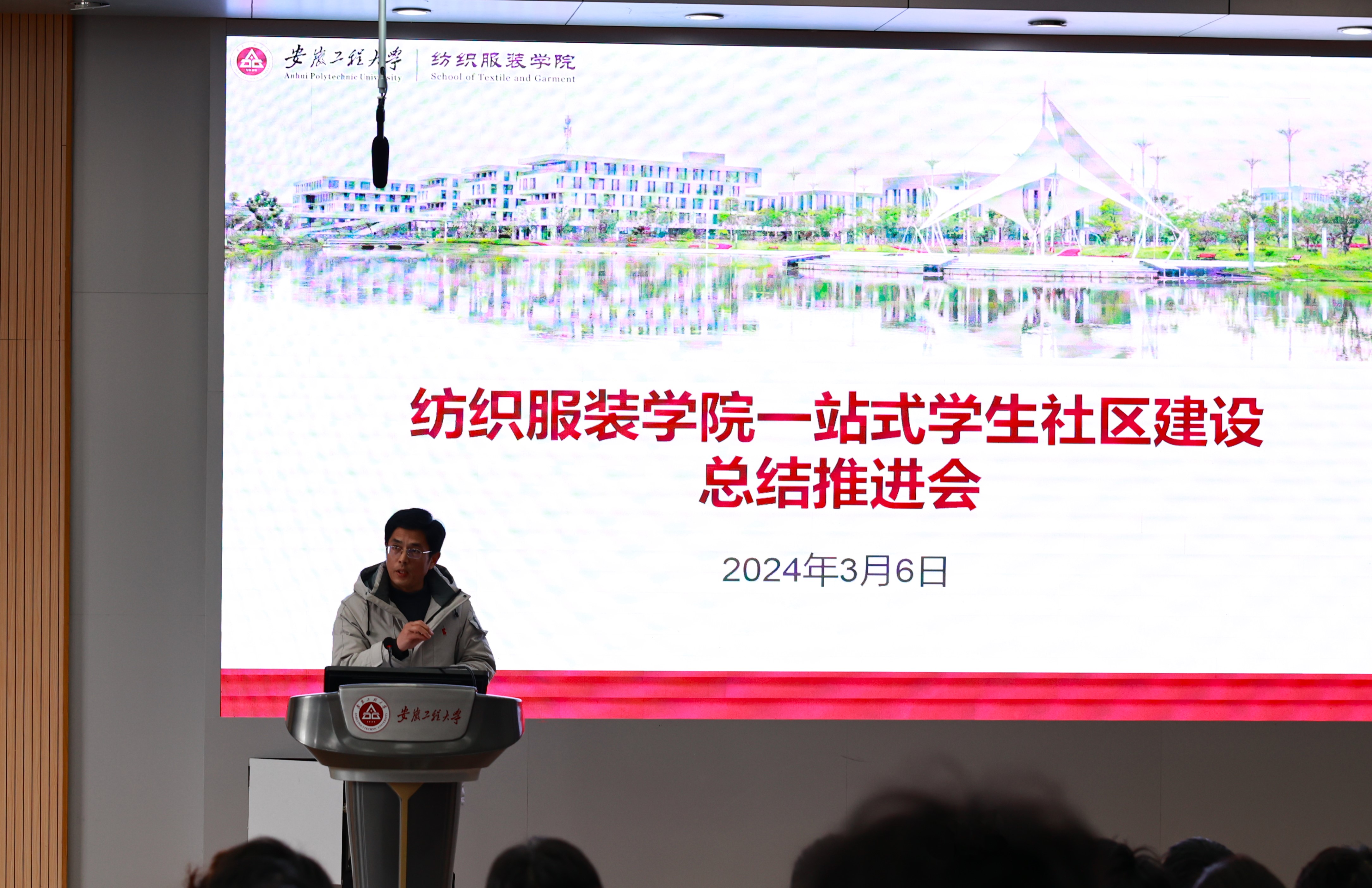 36日,纺织服装学院在5117举行“一站式”学生社区建设总结工作推进会。学院党委副书记梁雪松、校宿管科科长洪飞、学生社区建设指导老师童超梅、社区学生骨干以及全体寝室长参加会议,会议由院团委书记陈倩主持。