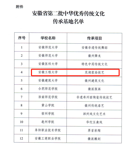 近日,安徽省教育厅公布了安徽省第二批中华优秀传统文化传承基地名单,学校获批安徽省第二批中华优秀传统文化传承基地,传承项目为纺织服装学院特色文化品牌项目“芜湖浆染技艺”,这也是我校首次获批该类省级基地。