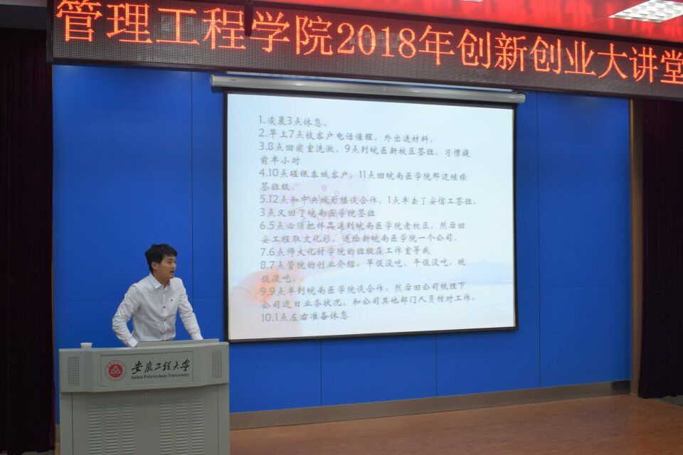 黄肖晓以《我的一天》为题,首先和学弟学妹们分享了他一天的工作,从早晨7点开始到凌晨1点,他的一天被分近十个工作段,接待客户约谈客户,整理公司业务,每一天的都过的非常的充实,因为有目标,从不觉得苦和累。他用朴实又不乏幽默的语言和同学们分享了自己的创业过程以及自己对大学生创业的一些心得。