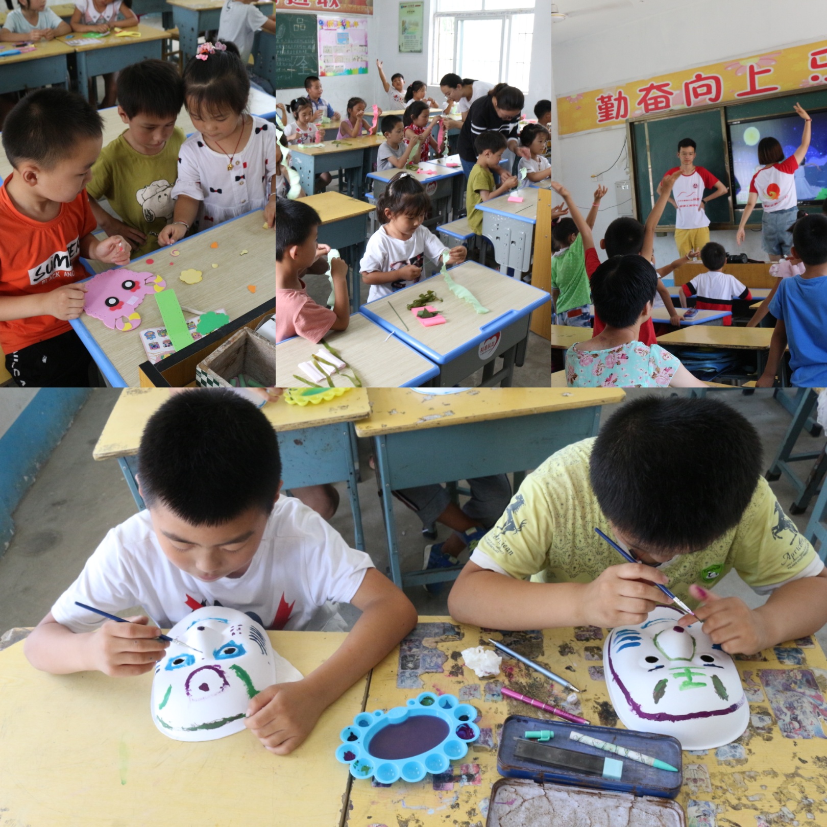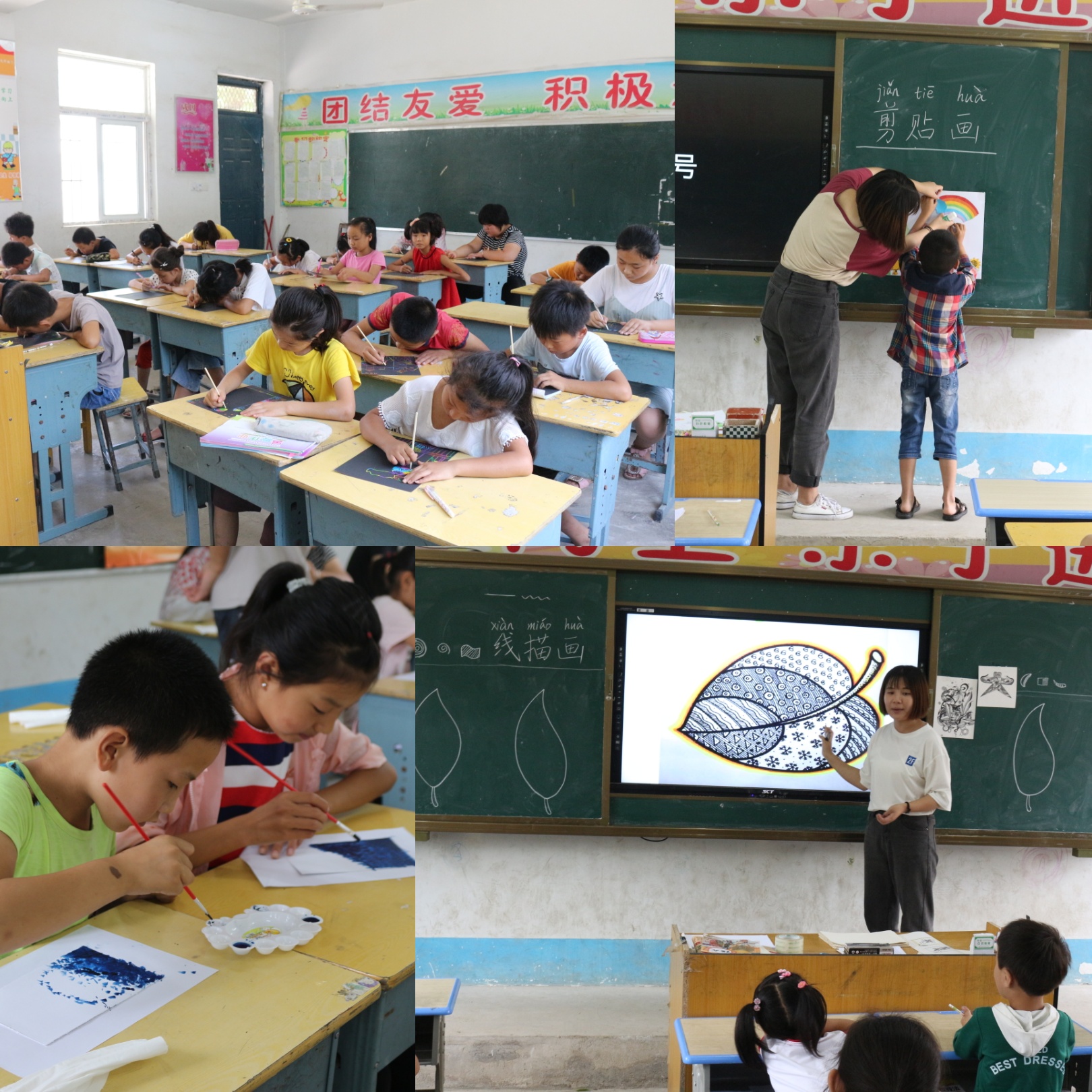 在孩子们的期待中,7号开始了第一天上课,每天上、下午各有三节课,本着“学习为主”的原则,每天都设置两节作业辅导课程,11位支教老师每人负责一个小组,一一对孩子们的作业进行检查,查缺补漏巩固孩子们基础课程的知识。为拓展孩子们视野,引导孩子们全面发展,还开设了阅读、绘画、手工、演讲、体育、素质拓展、竖笛课等。支教老师们的爱心和耐心得到了家长的肯定,丰富多彩的课程受到孩子们的喜爱和欢迎,最初统计有30个孩子参加,实际活动中每天有近60个孩子来到校园,同学们把孩子们按照年龄和年级分班、分组进行教学。