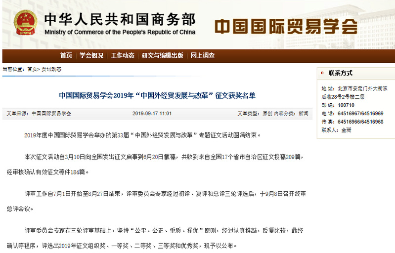 附:中国国际贸易学会2019年“中国外经贸发展与改革”征文获奖名单http://gmxh.mofcom.gov.cn/article/tongjixuehui/201909/20190902899663.shtml