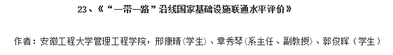 近日,2019年中国国际贸易学会举办的“中国外经贸发展与改革”征文获奖名单在中国国际贸易学会网站公示。经过初评、复评、终评和总评两个多月的四轮专家评选,最终从全国209篇稿件中共评选出一等奖、二等奖、三等奖、优秀奖论文56篇。由管理工程学院章秀琴副教授指导的题名分别为“一带一路沿线国家基础设施联通水平评价”(第一作者:国贸16邢康晴)、“安徽省制造业高质量发展的影响因素及对策”(第一作者:国贸17郭俊晖)的两篇论文均获得优秀奖。