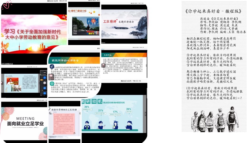 主题班会学习了中共中央、国务院印发的《关于全面加强新时代大中小学劳动教育的意见》,并在班级群中对加强新时代大学生劳动教育的内涵、意义、必要性、实施的途径等各个方面展开讨论。许多班级还总结了班级的讨论结果,并以PPT汇报的形式进行展示。在此次主题班会活动中,各班级从大学专业学习、班级学风建设、大学生对未来就业创业规划、传承工匠精神、向时代楷模学习等不同方面对文件精神进行解读。同学们纷纷表示劳动教育应该成为自己成长过程中的必修课,新时代的劳动教育有新内涵,体力和脑力都是劳动,更重要的是树立劳动精神、崇尚劳动、尊重劳动、热爱劳动。