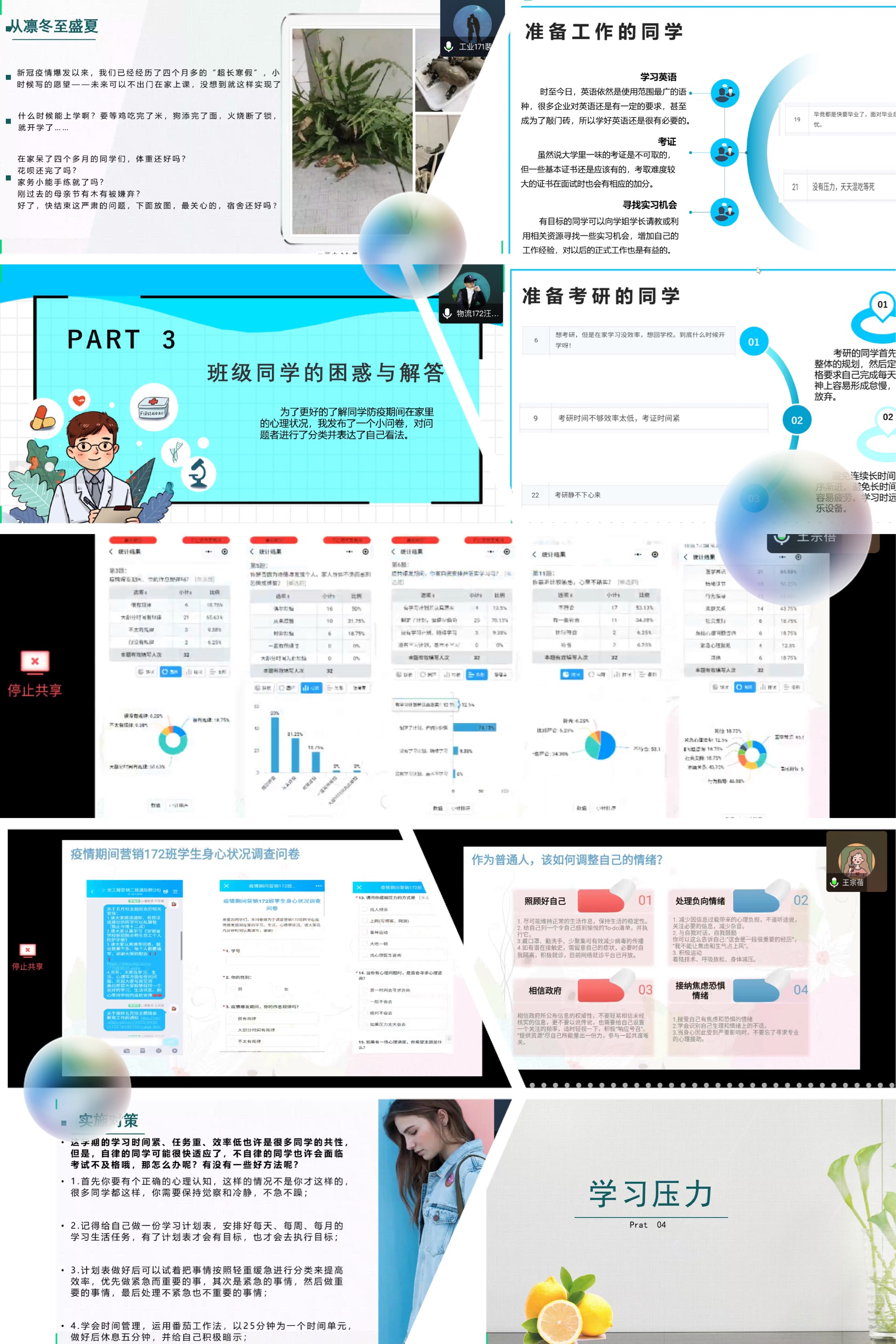 积极的线上讨论与共享。在各班级的主题班会上,同学们围绕如何高效进行线上学习抗击疫情期间易发的心理问题疫情期间如何面对考研求职压力问题?“返校后如何进行心理调适”等话题进行线上讨论,同学们纷纷发表见解与看法,交流心得与体会通过积极交流,引导同学们理性看待疫情,以积极的心态和努力学习式来抗,积极创业就业,开展学习
