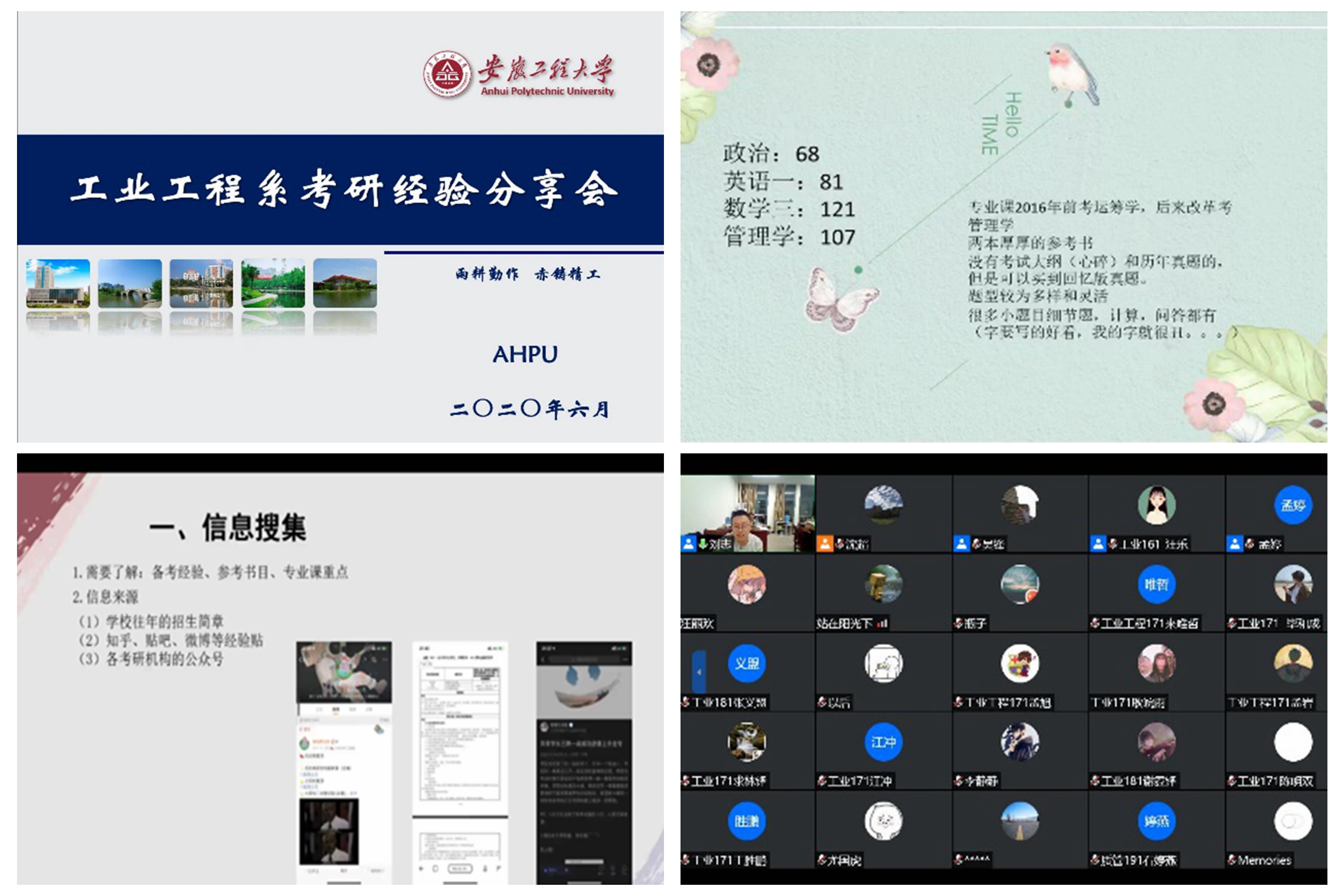 617日晚上,工业工程系教师党支部邀请今年考取研究生的三位同学给备战2021年考研的学弟学妹们线上分享考研经验和心得,并安排刘志、吴锋两位老师介绍往年考研情况、分析今年考研形势和解读考研相关政策,指导就业工作