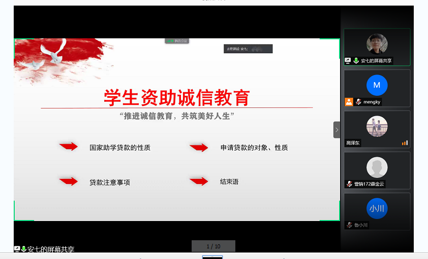 毕业班辅导员赵恒梅、周向阳、吴兆克与所带班级已办理国家助学贷款的毕业生进行“一对一”诚信教育谈话,线上宣讲征信与诚信知识,引导其尊崇和倡导契约精神,及时履行国家助学贷款合同。并通知贷款毕业生进行“生源地贷款毕业生诚信还款线上答题”,线上签订《助学贷款还款承诺书》。
