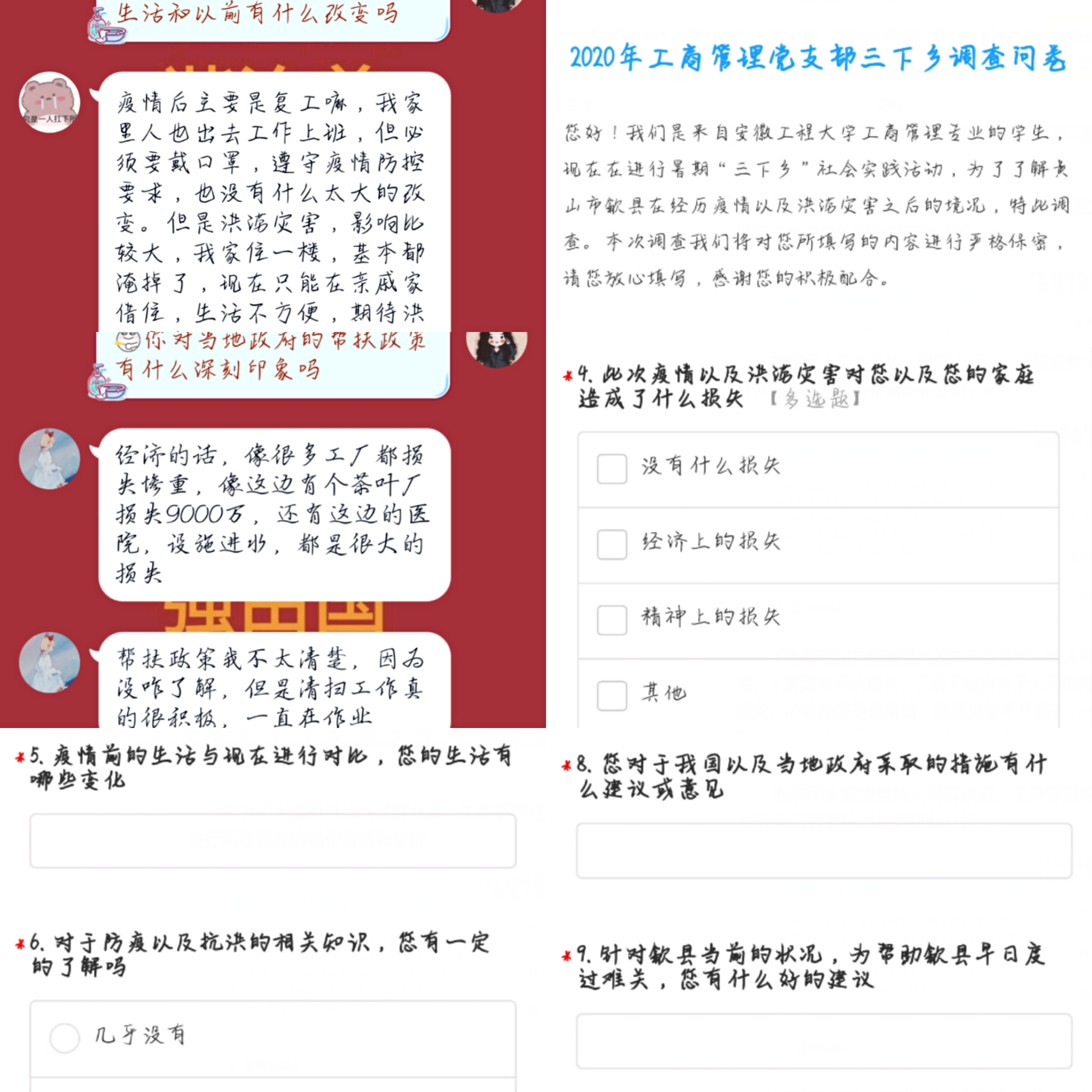 入夏以来,南方大范围强降雨引发各地汛情告急。为深入了解汛情下的人民生产生活状况和地方推动复工复产的政策,工商管理专业学生党支部三下乡团队于今年七月份选择到汛情严峻的安徽黄山歙县进行调研,通过线上进行访问,考察汛情对当地社会经济、企业生产和居民生活的影响,进而揭示新时代中国特色社会主义制度的优越性,开展暑期“三下乡”社会实践活动。