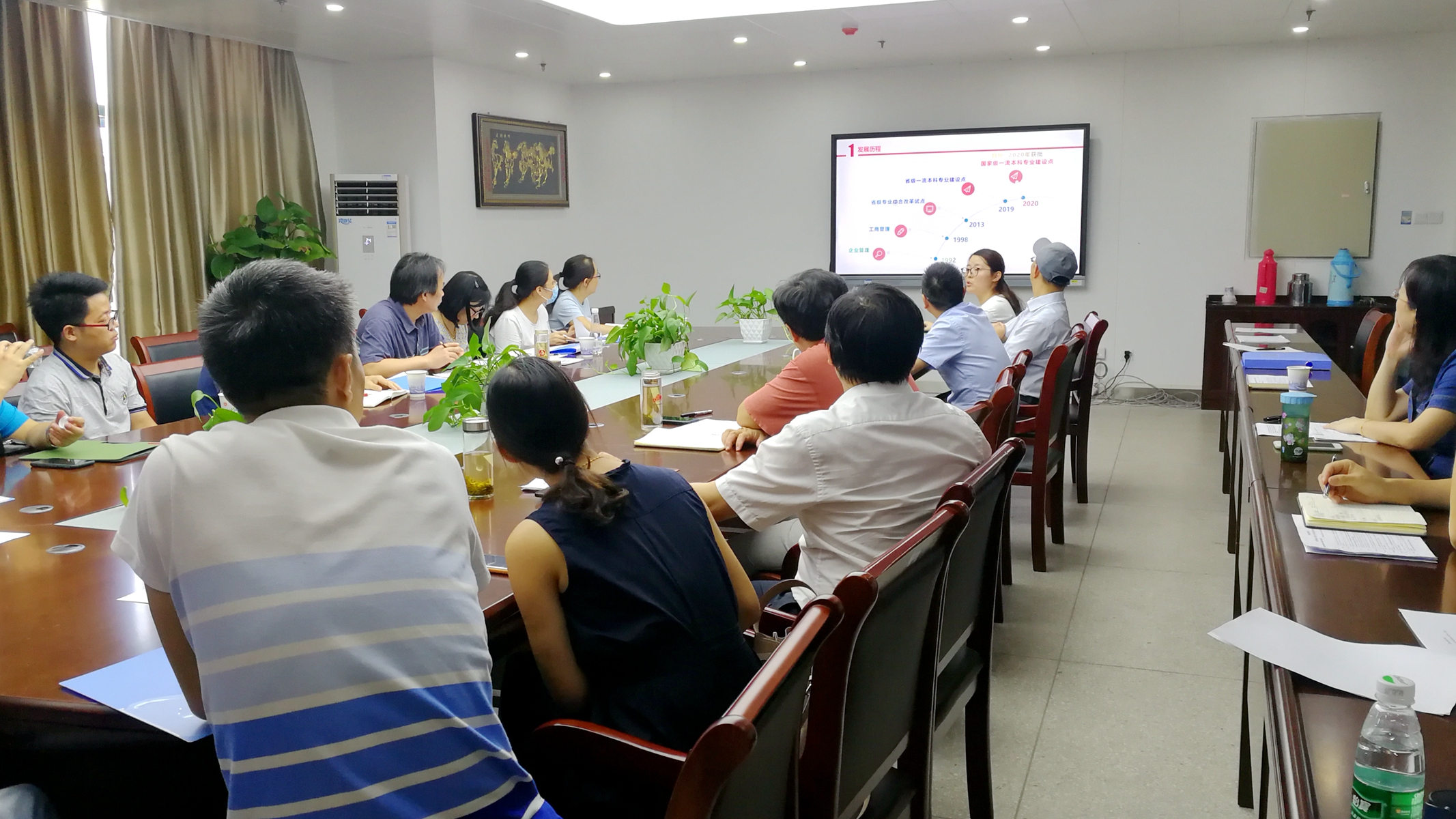 管理工程学院副院长谢荣见对标“双基”标准化建设及示范创建指标点和观测点,对学院关于标准化验收和示范推荐工作进行了总体工作汇报。工商管理系副主任王凤莲从组织建设、教学活动、教学建设、教学研究和教学成果五个一级指标点等方面向各位评审专家汇报了工商管理系基层教学组织标准化达标建设与示范申报情况。汇报结束后,评审组成员现场查阅了各个基层教学组织“双基”建设各项支撑材料,并提出了宝贵的建设性意见。会后,参会人员就在“双基”标准化建设和示范创建工作中取得的经验进行了深入交流。