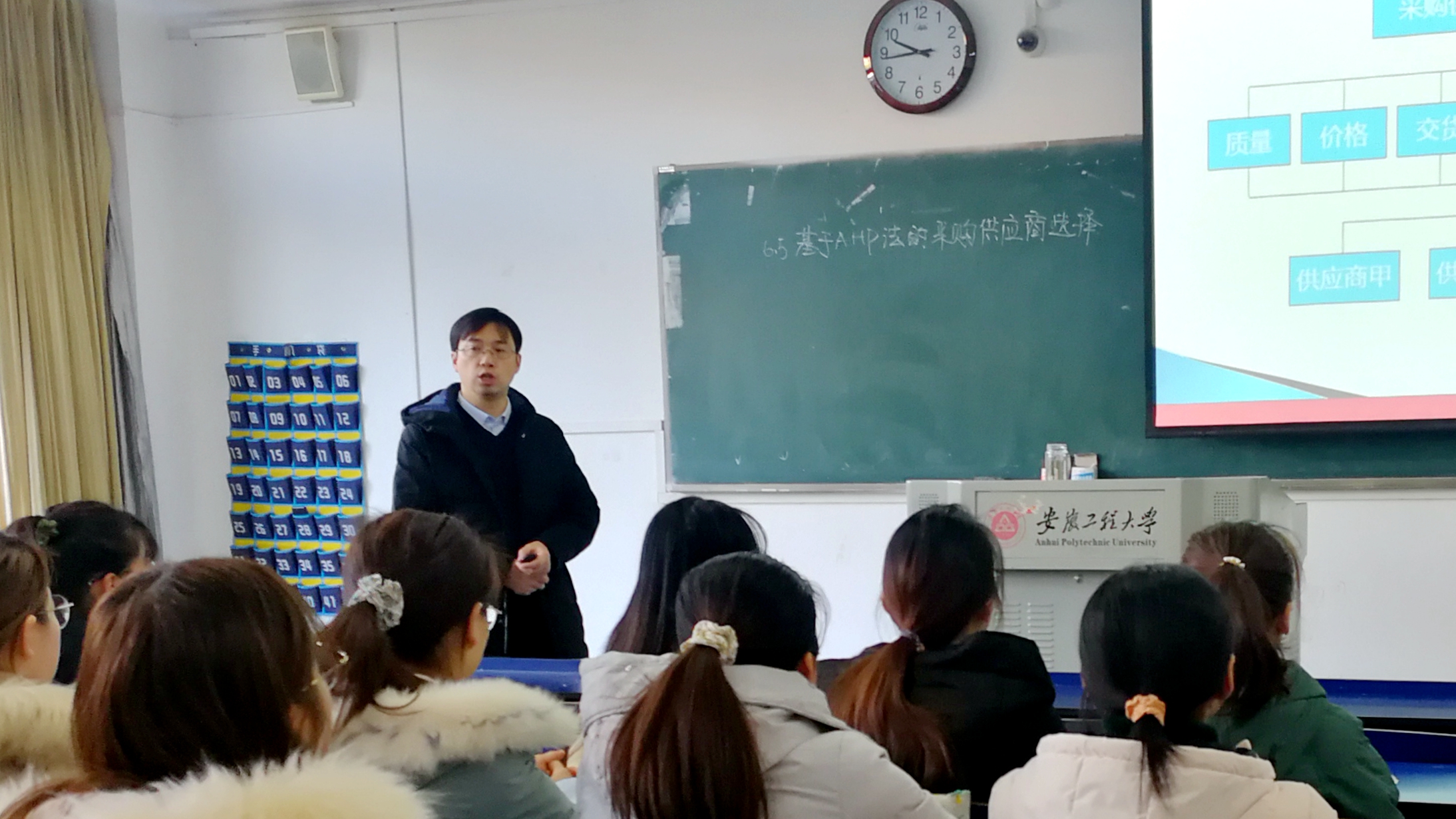 本次观摩教学主讲课程为《采购管理》,主要讲授内容为AHP法及其在采购供应商选择中的应用。张老师授课思路清晰,语言幽默,重难点处理得当,理论与案例相结合,注重学生课堂参与度,课堂气氛活跃,学生认真思考,积极回答问题,教学效果佳。