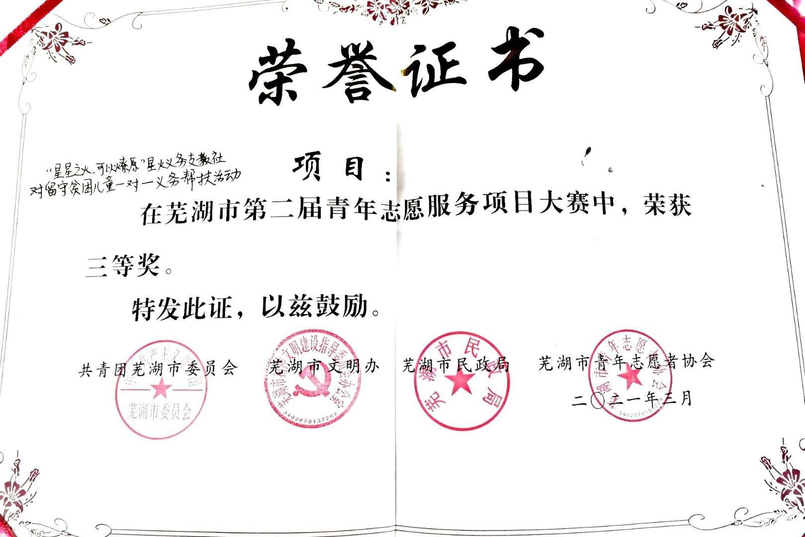 日前,我校星火义务支教社申报的“星星之火,可以燎原”星火义务支教社对留守贫困儿童一对一义务帮扶志愿服务项目,荣获芜湖市第二届青年志愿服务项目大赛三等奖。