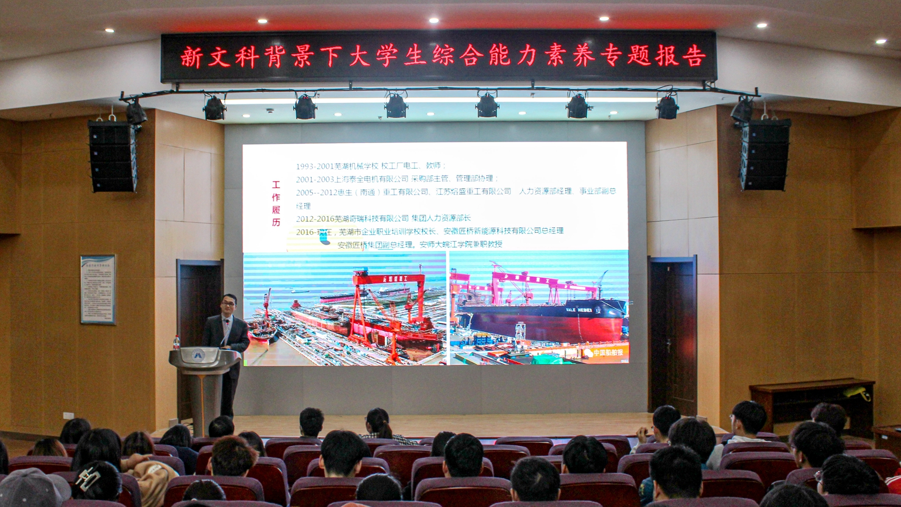 331日下午,经济与管理学院工商管理系邀请安徽匠桥集团副总经理、安徽匠桥新能源科技有限公司总经理、芜湖企业职业培训学校校长杨咸华博士(高级经济师、兼职教授)为工商管理和人力资源管理专业的学生做新文科背景下大学生综合能力素养专题报告,报告题目为“企业视角下大学生的综合素养”。工商管理、人力资源管理专业的近200名学生,工商管理系部分教师聆听了本次报告会。报告会由经济管理学院副院长谢荣见主持。