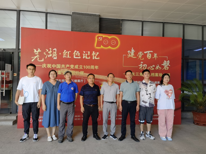 8月30日下午,校团委书记郭广春、经济与管理学院党委副书记章兵、程繁、院团委副书记赵恒梅来到芜湖市档案馆,看望慰问正在这里开展社会实践的学生。芜湖市档案馆馆长陶泰山,办公室主任张照军,开发利用科科长徐玲芝等陪同参观《芜湖·红色记忆——庆祝中国共产党成立100周年档案资料图片展》。