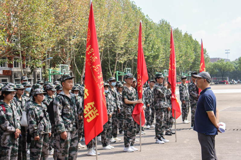 916日上午在风雨篮球场举行经济与管理学院2021年新生军训动员大会。出席本次大会的有学院党委副书记程繁、院团委副书记赵恒梅,辅导员高天宇徐博及2021级全体新生。