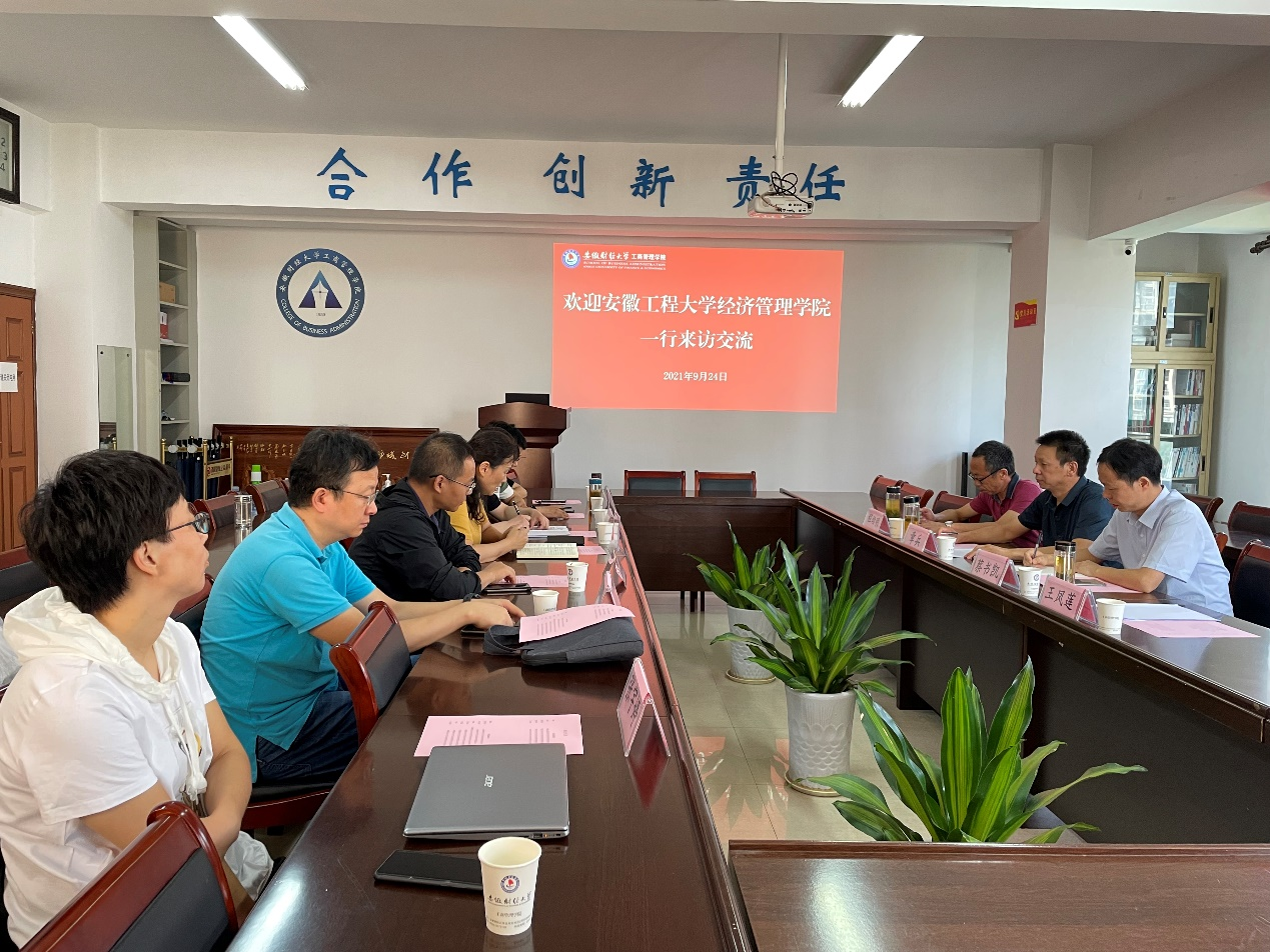 为了进一步推动学院的学科建设、专业建设、MBA专业硕士点建设,提升学院社会服务能力,9月24日,学院党委副书记章兵、副院长蔡书凯教授、管理科学与工程硕士点负责人程幼明教授、工商管理系主任王凤莲博士一行四人,前往安徽财经大学工商管理学院学习调研。