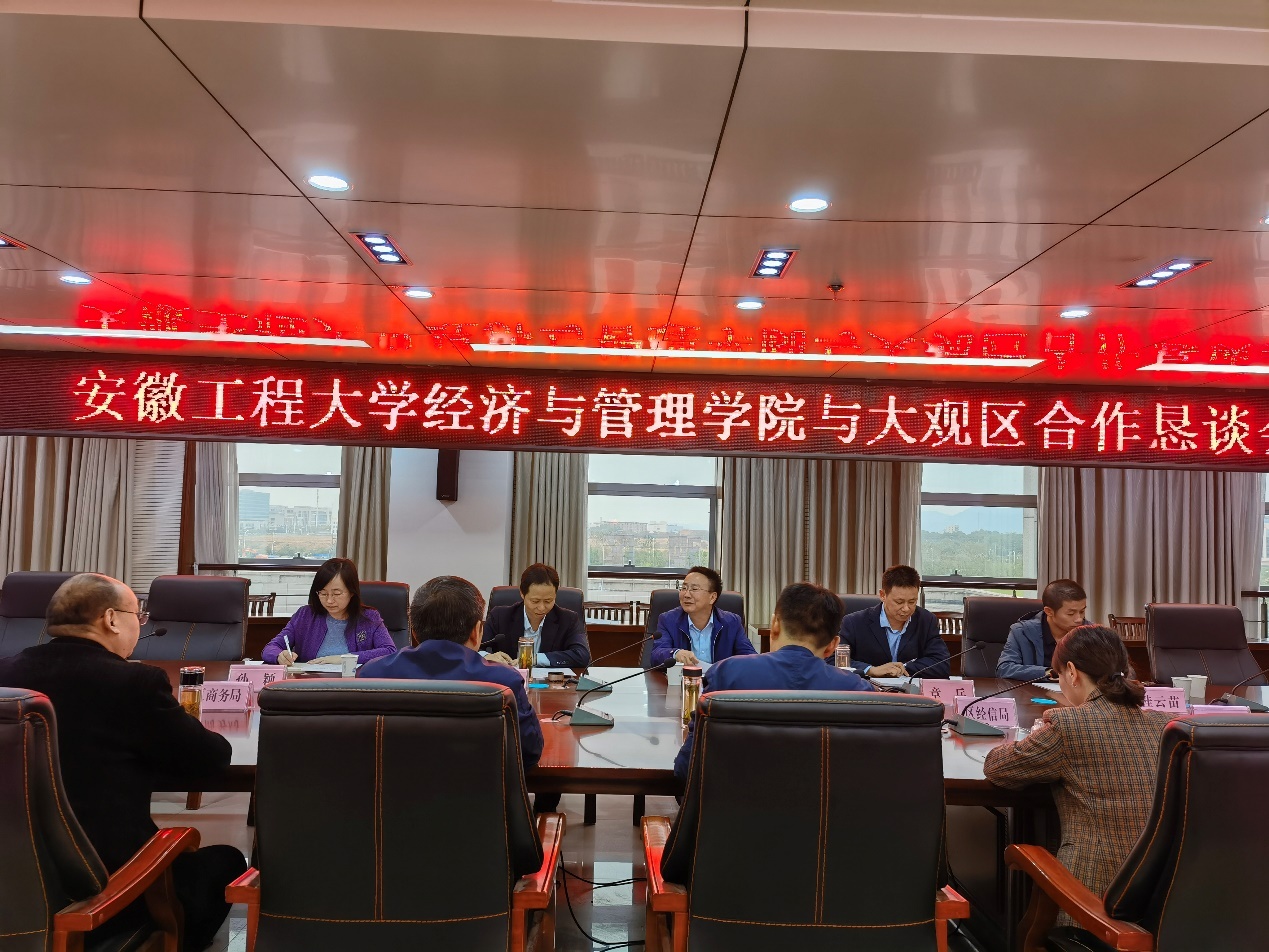 为深入推进学院产学研合作、毕业生就业、MBA招生与导师遴选、人才培养等工作,10月11日,经济与管理学院党委副书记章兵、院长龚本刚、副院长蔡书凯、物流科学系主任桂云苗、市场营销系副主任孙颖一行赴安庆市大观区政府就校政合作事宜进行洽谈。安庆市大观区副区长、经济与管理学院校友徐进军、大观开发区管委会副书记何祯辉、大观区相关部门领导、相关企业代表出席洽谈会。