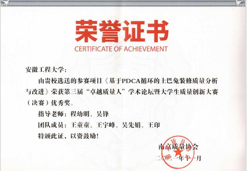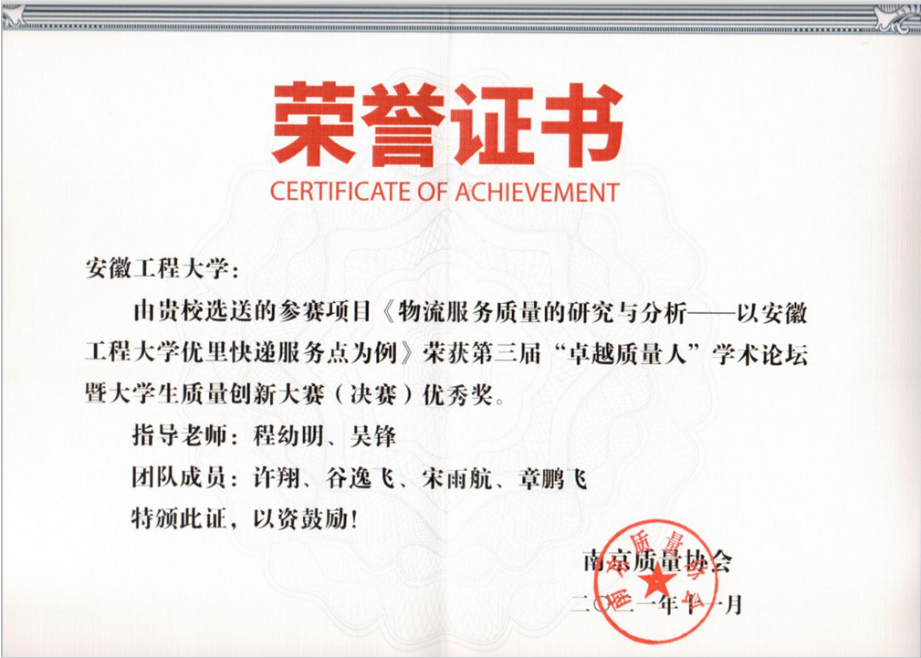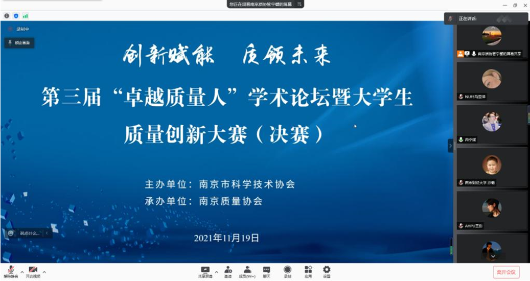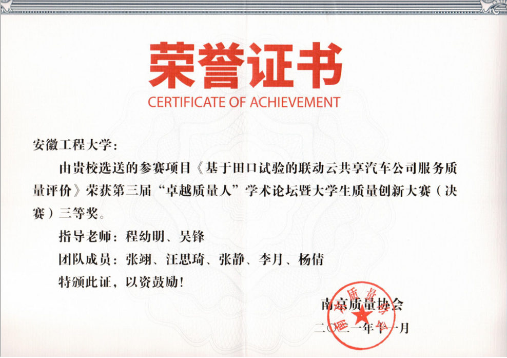 2021年11月19日,由南京质量协会主办的全国第三届“卓越质量人”学术论坛暨大学生质量创新大赛决赛线上举行,我院代表队首次参加并获得佳绩,张翊队荣获三等奖,王童童队和许翔队荣获优秀奖。