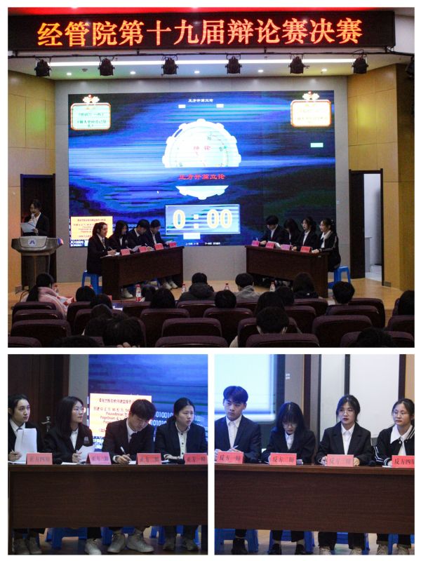 为提高学院学生心理素质水平,锻炼思维反应能力,经济与管理学院于2022年3月20日下午在c座七楼报告厅举办了院第十九届辩论赛决赛,本次决赛由两场辩论赛组成。学生处赵静云老师、马克思主义学院张小峰老师、院团委书记赵恒梅老师、校辩论队副队长孙宇彤、演协辩论队队长周铖以及往届优秀辩手陈淑娅担任评委,选手亲友团观摩了此次比赛。