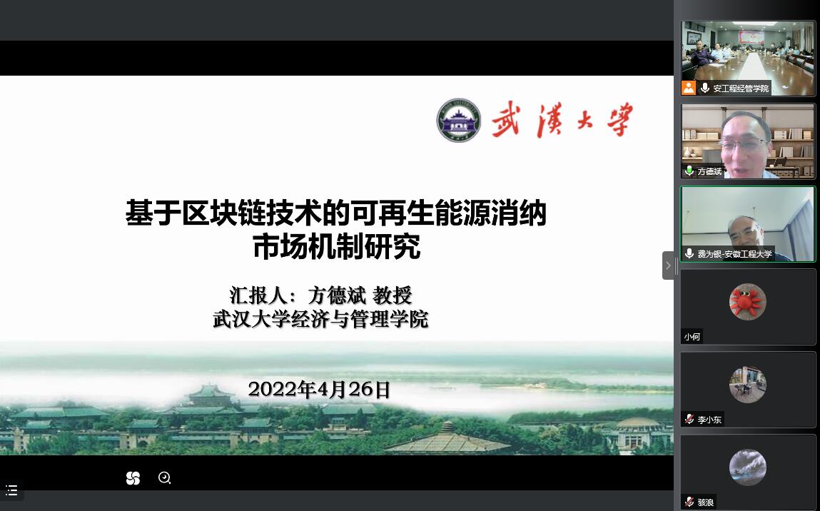 报告会上,方德斌教授作了题为《基于区块链技术的可再生能源消纳市场机制研究》的学术报告。方教授从区块链技术的发展背景出发介绍了区块链技术在能源消纳、电网配套服务和电力市场等电力领域的应用;接着,在分析比较国际、国内可再生能源消纳机制经验的基础上,方教授与大家分享了湖北可再生能源消纳市场机制、碳市场交易和电力市场交易协调机制,以及基于区块链的可再生能源电力交易平台等研究及应用成果,并提出在“双碳”目标下如何推动碳市场和电力市场协同发展,进一步发挥可再生能源在碳市场中的潜在价值,助力实现“碳中和”、“碳达峰”目标的策略与建议。
