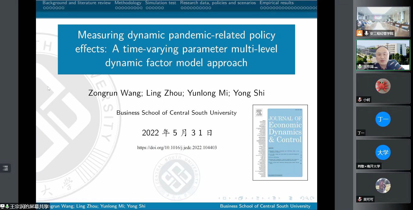 报告会上,王宗润教授作了题为《Measuring dynamic pandemic-related policy effects: A time-varying parameter multi-level dynamic factor model approach》的学术报告。王教授从文献研究背景、模型构建和方法论、仿真测试、抗疫数据研究、抗疫政策和场景分析等方面介绍了基于时变参数多层动态因素模型的流行病动态政策效果测定,说明了对公共政策有效性进行评估可以为政策制定者提供有力的事实支撑。