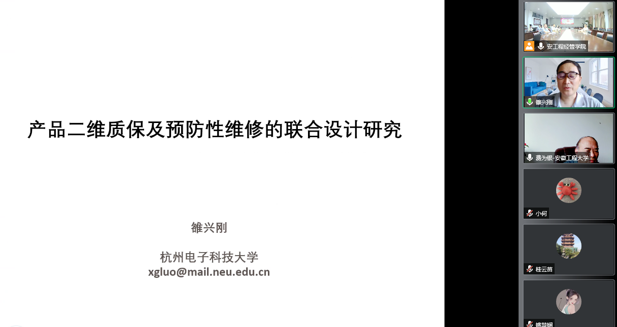 报告会上,雒兴刚教授作了题为《产品二维质保及预防性维修的联合设计研究》的学术报告。他从汽车行业二维质保对市场竞争影响的案例出发,详细分析了二维质保和预防性维修的联合设计优化模型和算法,通过数值实验,说明了在充分考虑制造商和顾客学习效应的影响下,确定最优的预防性维修次数,为制造商设计合理的质保策略提供理论支撑,实现制造商销售利润的最大化,实现制造商和消费者双赢。
