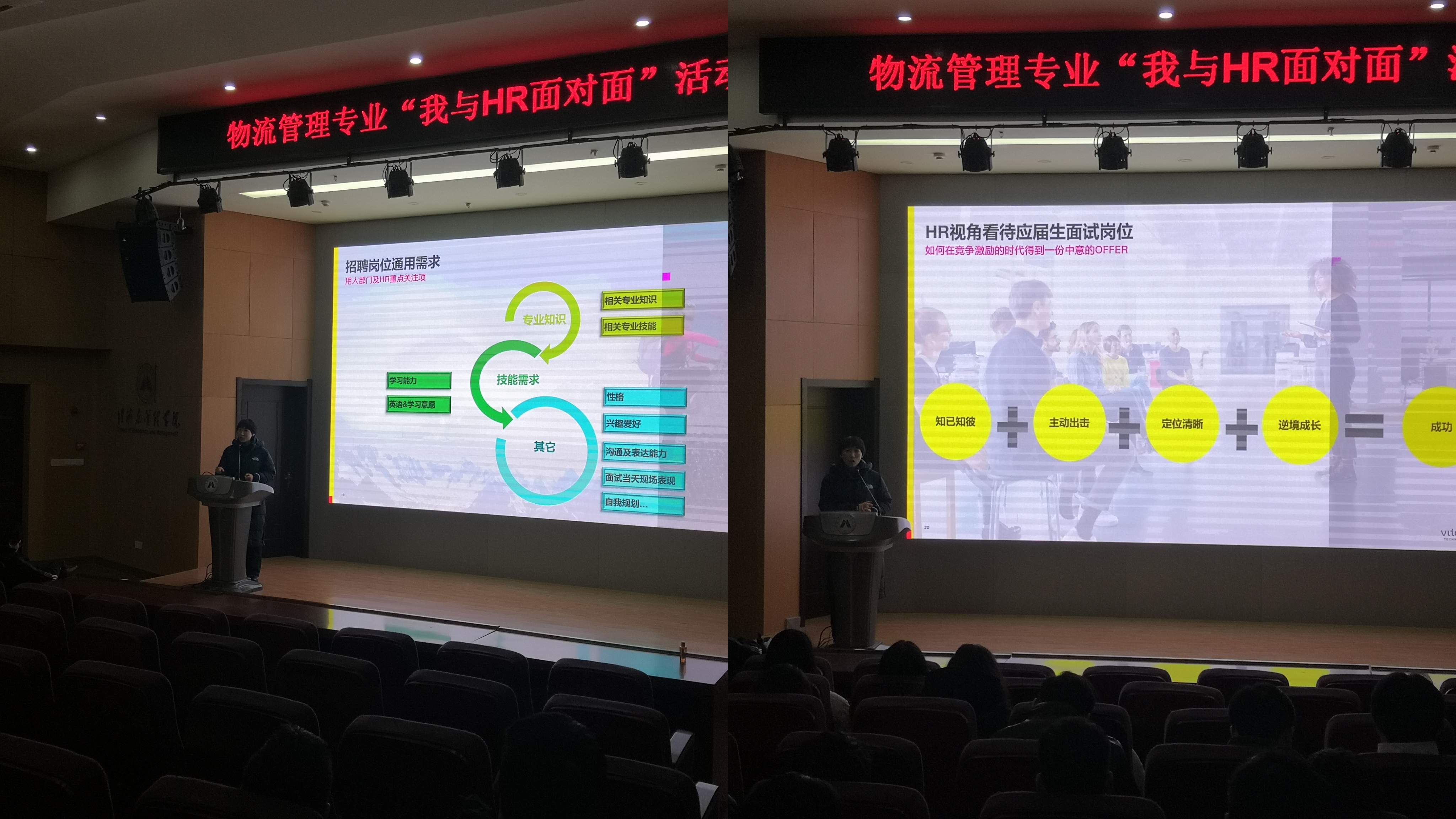 报告中,纬湃公司HR王珍从专业知识、技能需求以及其它方面为同学们介绍了招聘岗位的通用需求。无论是相关专业知识、技能,还是面试者自身学习能力、兴趣爱好、面试现场表现,以及面试者的性格、沟通和语言表达能力,都是用人部门和公司HR重点关注的选项,她还指出,对于一位应届毕业生来说,如何在招聘岗位竞争激烈的情况下,想要得到一份中意的offer,大家一定要“知己知彼”“主动出击”“定位清晰”“逆境成长”,如此方能走向成功。