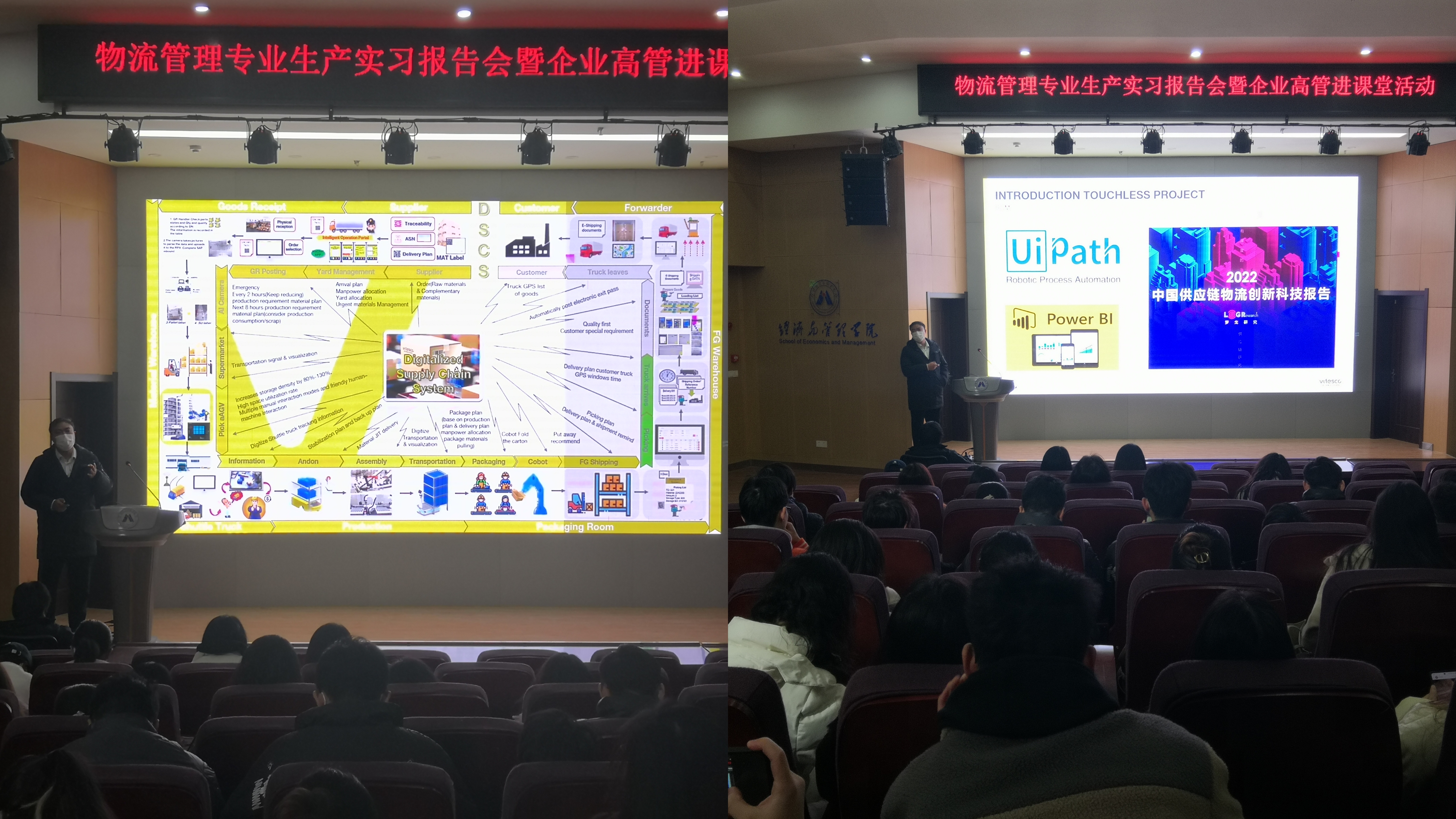 最后,针对同学们的提问,尹坤耐心解答了相关的问题,鼓励同学们在学习理论知识同时也要深入地了解企业的物流与供应链管理实践,学习和掌握一些与企业数字化转型相关的软件,如UiPath,Power-BI等商业智能软件,以适应未来的应聘和工作需要。现场气氛活跃,同学们热情极高,纷纷表示受益匪浅。报告会在同学们热烈的掌声中结束。