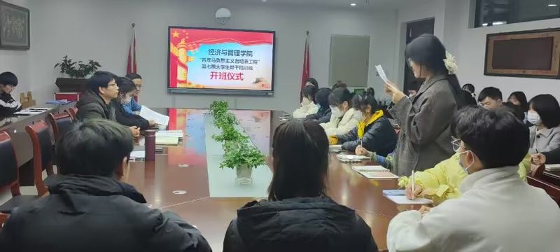 开班仪式在雄壮的国歌声中拉开帷幕。学院团委书记赵恒梅宣读《关于举办经济与管理学院“青年马克思主义者培养工程” 第七期大学生骨干培训班的通知》。刘海涛从政治表现、培养机制、激励机制、淘汰机制等方面宣读了青马班考核制度,强调了纪律要求。学员代表国贸222班卞霞发言。她表示,将会珍惜青马班学习的机会,加强政治理论学习,严格遵守规章制度,积极配合各项工作,展现青年风范,争做新时代优秀青年。
